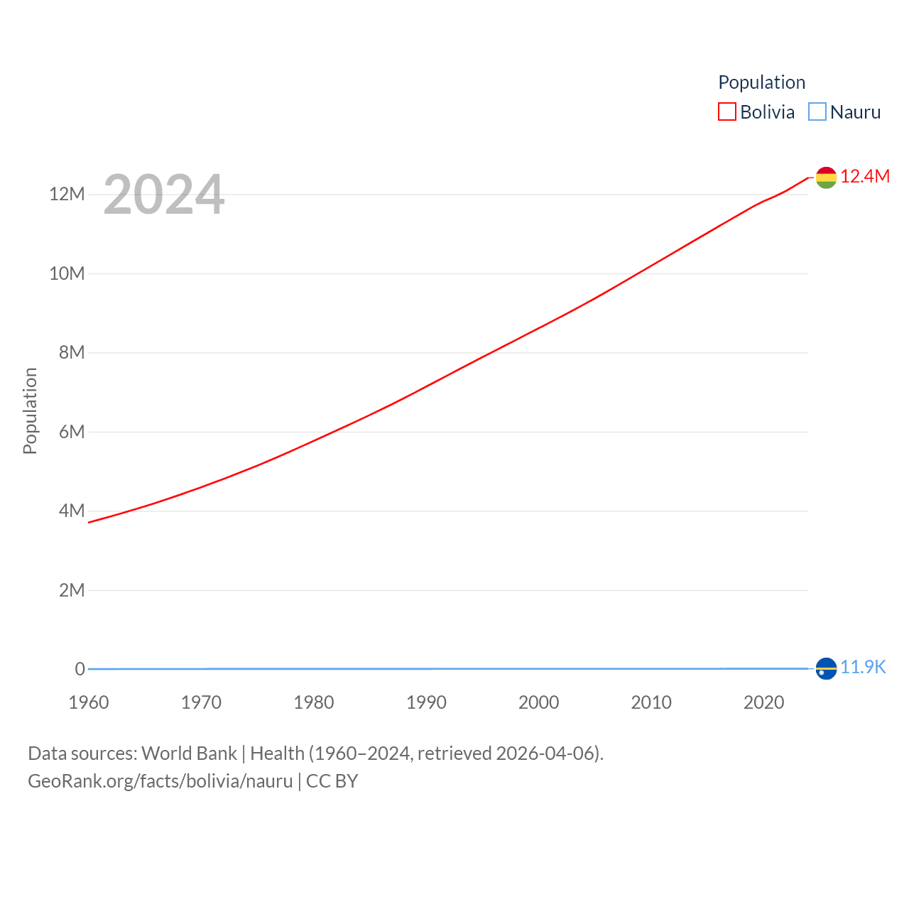 Bolivia has a population of 12.4M (ranked 79/197), compared with 11.9K in Nauru (ranked 195/197). Bolivia's land area is 418,264 sq mi versus 7.72 sq mi for Nauru (ranked 27th vs. 195th).