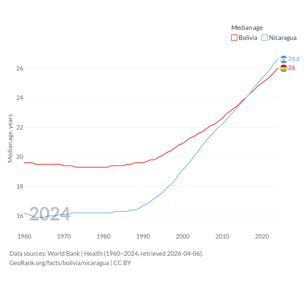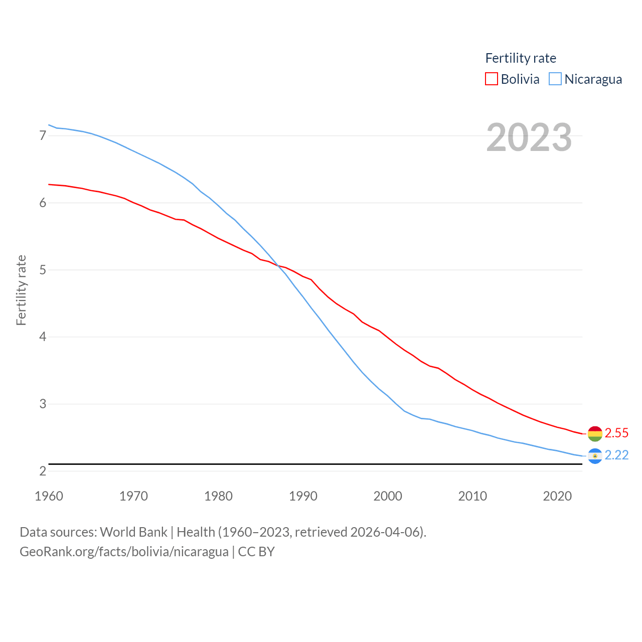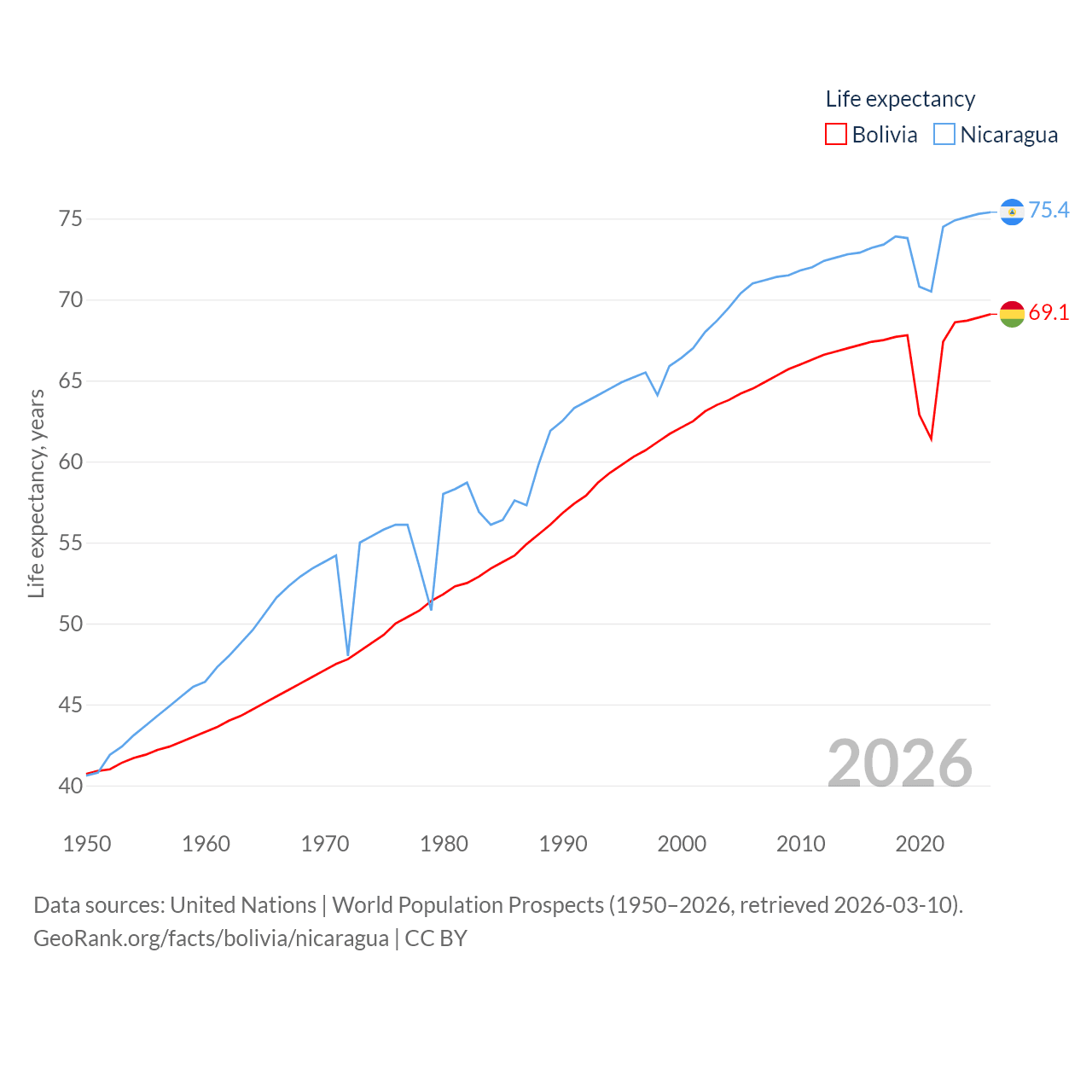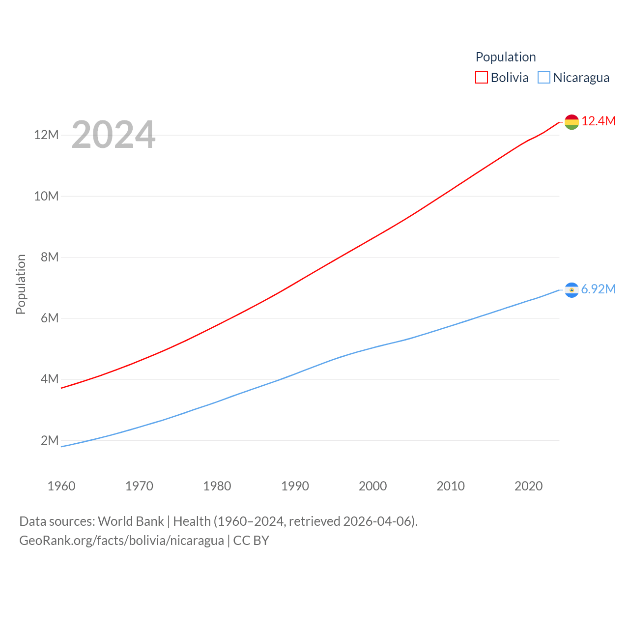 Bolivia has a population of 12.4M (ranked 79/197), compared with 6.92M in Nicaragua (ranked 108/197). Bolivia's land area is 418,264 sq mi versus 46,464 sq mi for Nicaragua (ranked 27th vs. 98th).