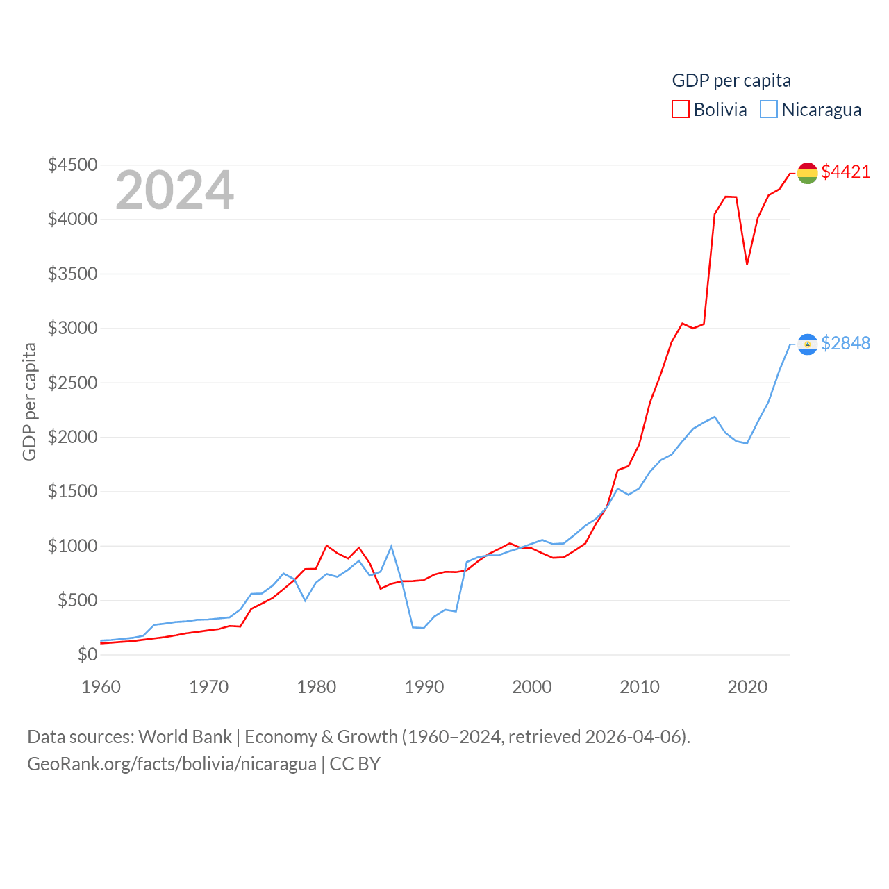 By GDP, Bolivia ranks 88/197 ($54.9B) and Nicaragua ranks 131/197 ($19.7B). By GDP per capita, Bolivia ranks 125/197 ($4,421), while Nicaragua ranks 141/197 ($2,848).