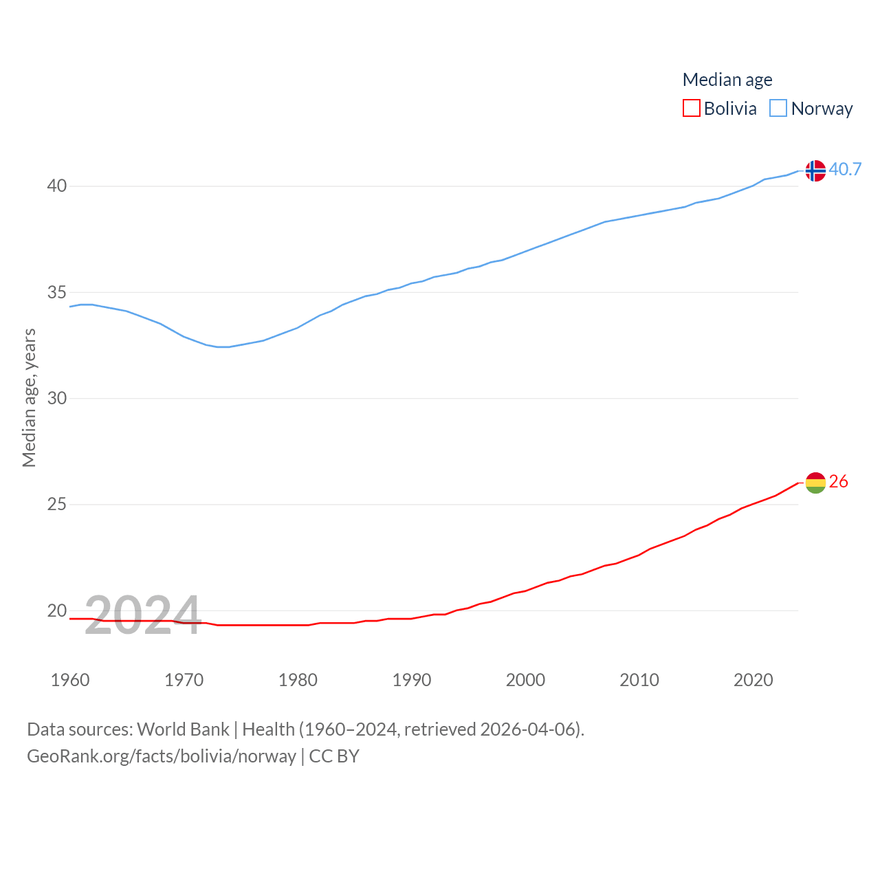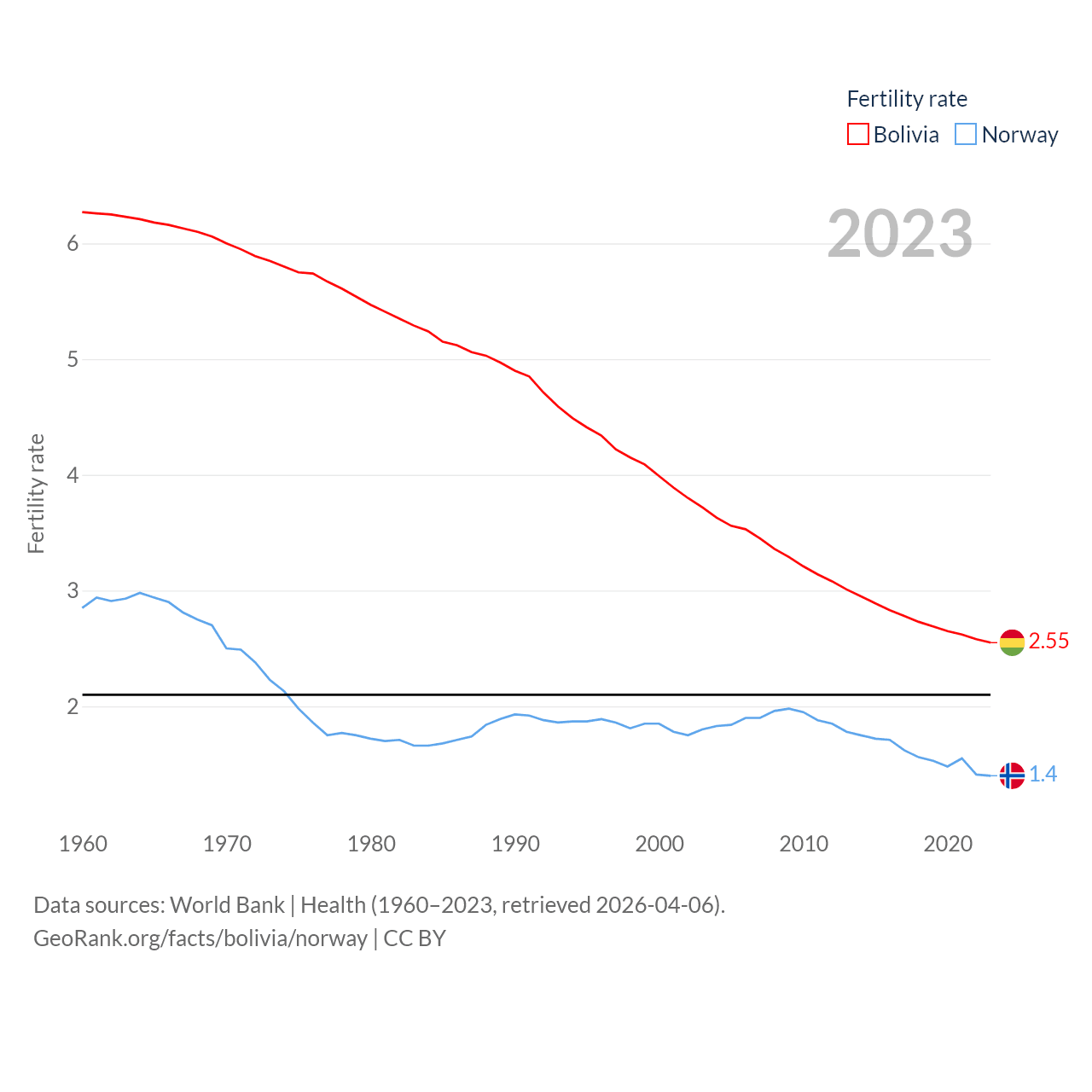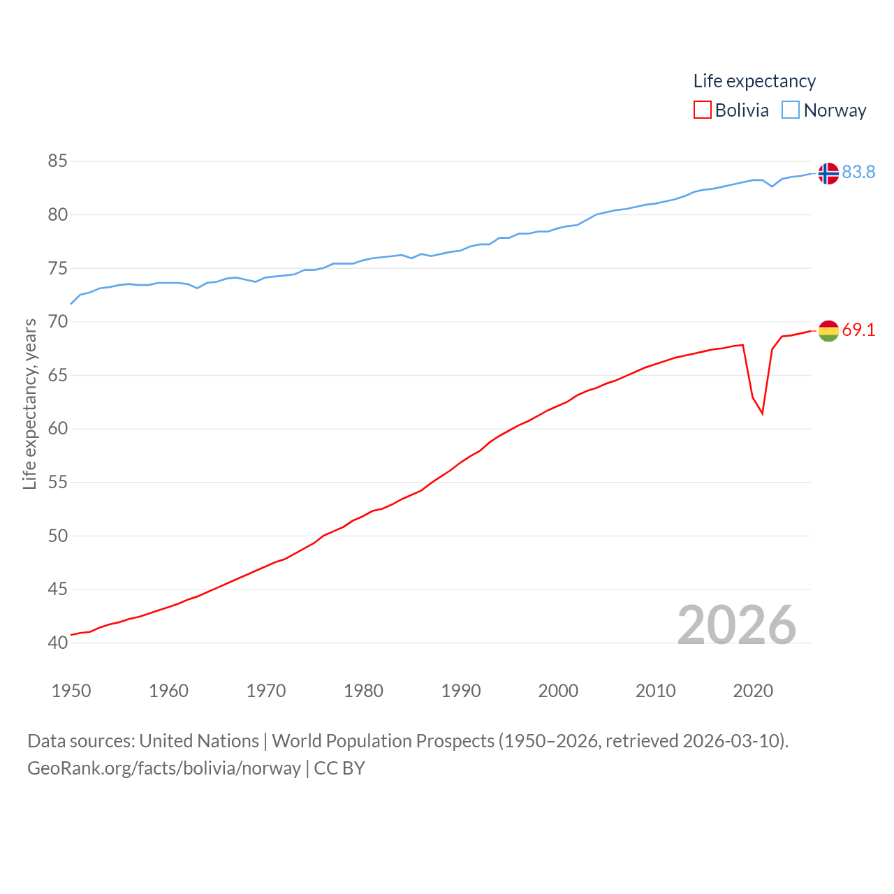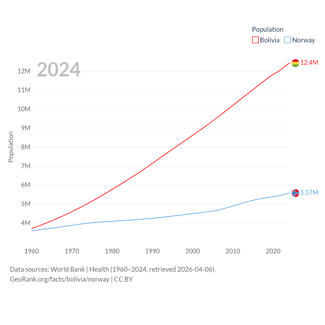 Bolivia has a population of 12.4M (ranked 79/197), compared with 5.57M in Norway (ranked 118/197). Bolivia's land area is 418,264 sq mi versus 140,645 sq mi for Norway (ranked 27th vs. 62nd).