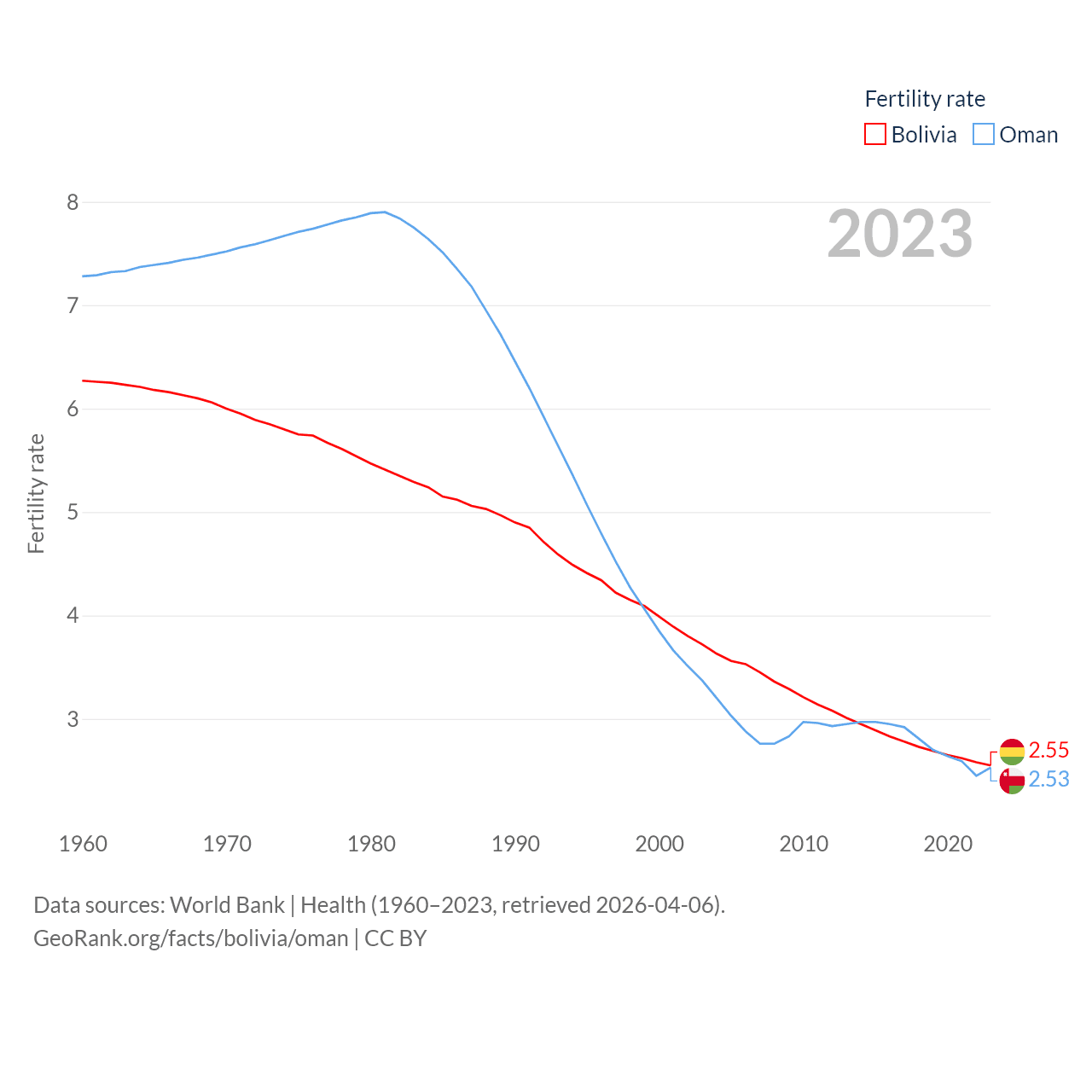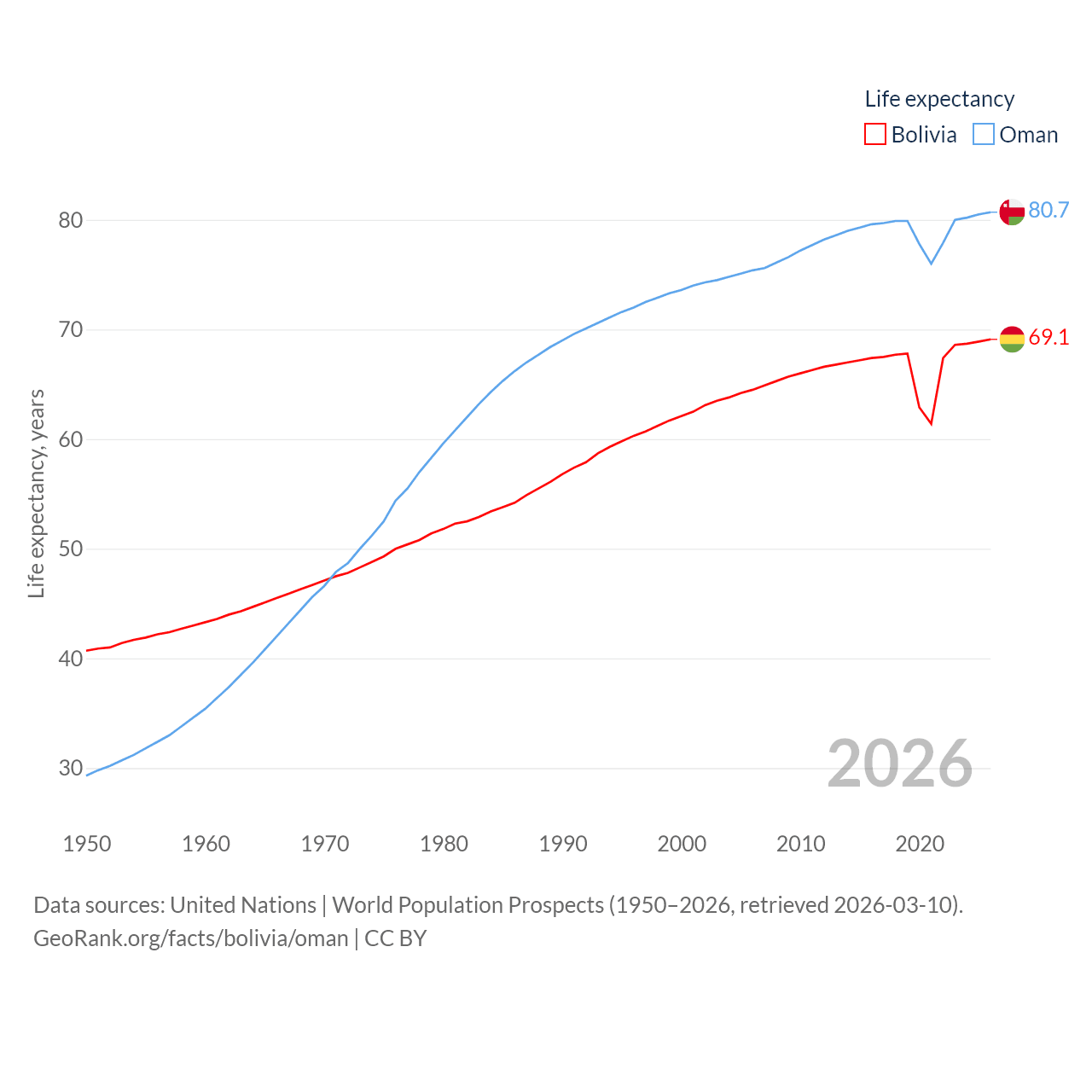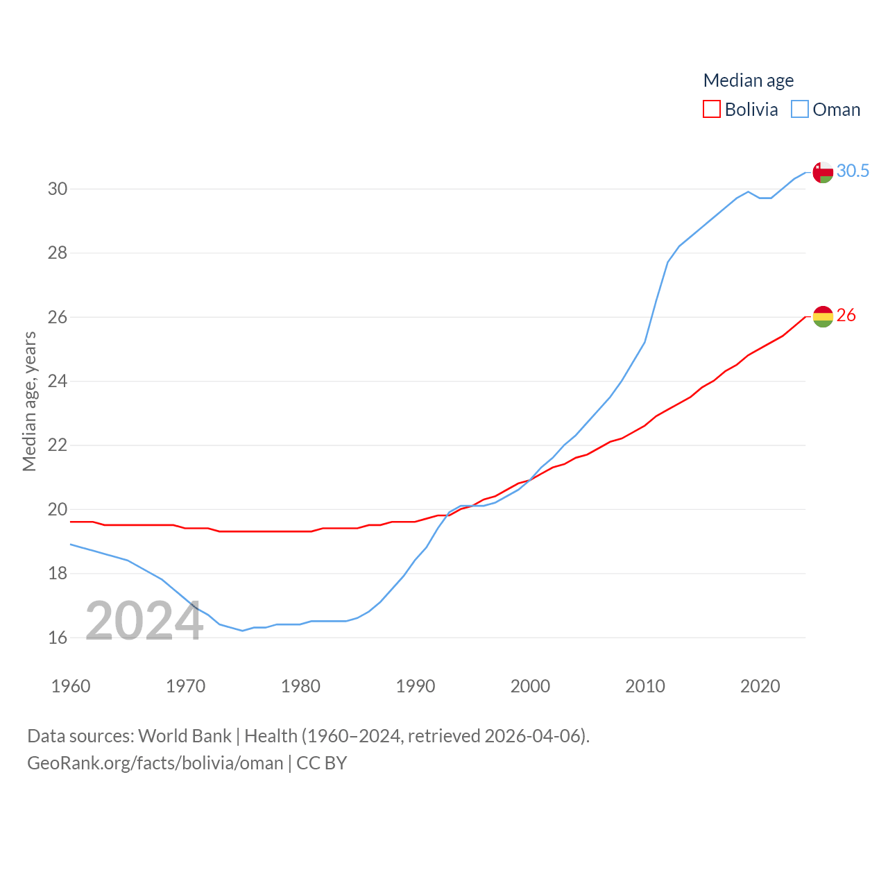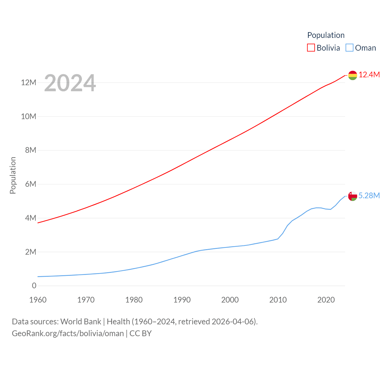Bolivia has a population of 12.4M (ranked 79/197), compared with 5.28M in Oman (ranked 124/197). Bolivia's land area is 418,264 sq mi versus 119,499 sq mi for Oman (ranked 27th vs. 68th).