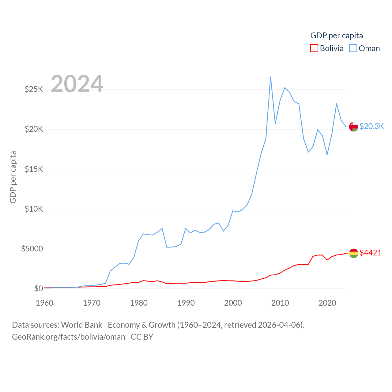 By GDP, Bolivia ranks 88/197 ($54.9B) and Oman ranks 70/197 ($107B). By GDP per capita, Bolivia ranks 125/197 ($4,421), while Oman ranks 57/197 ($20,285).