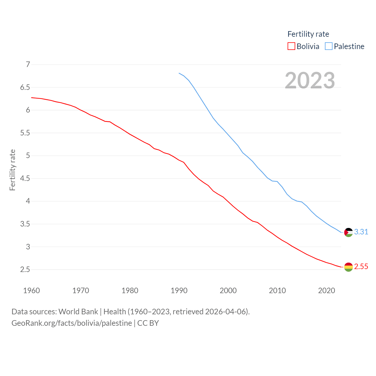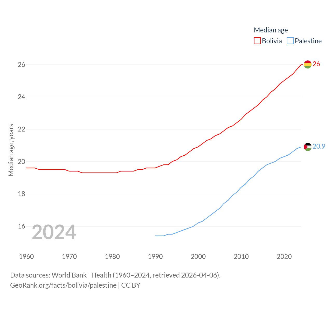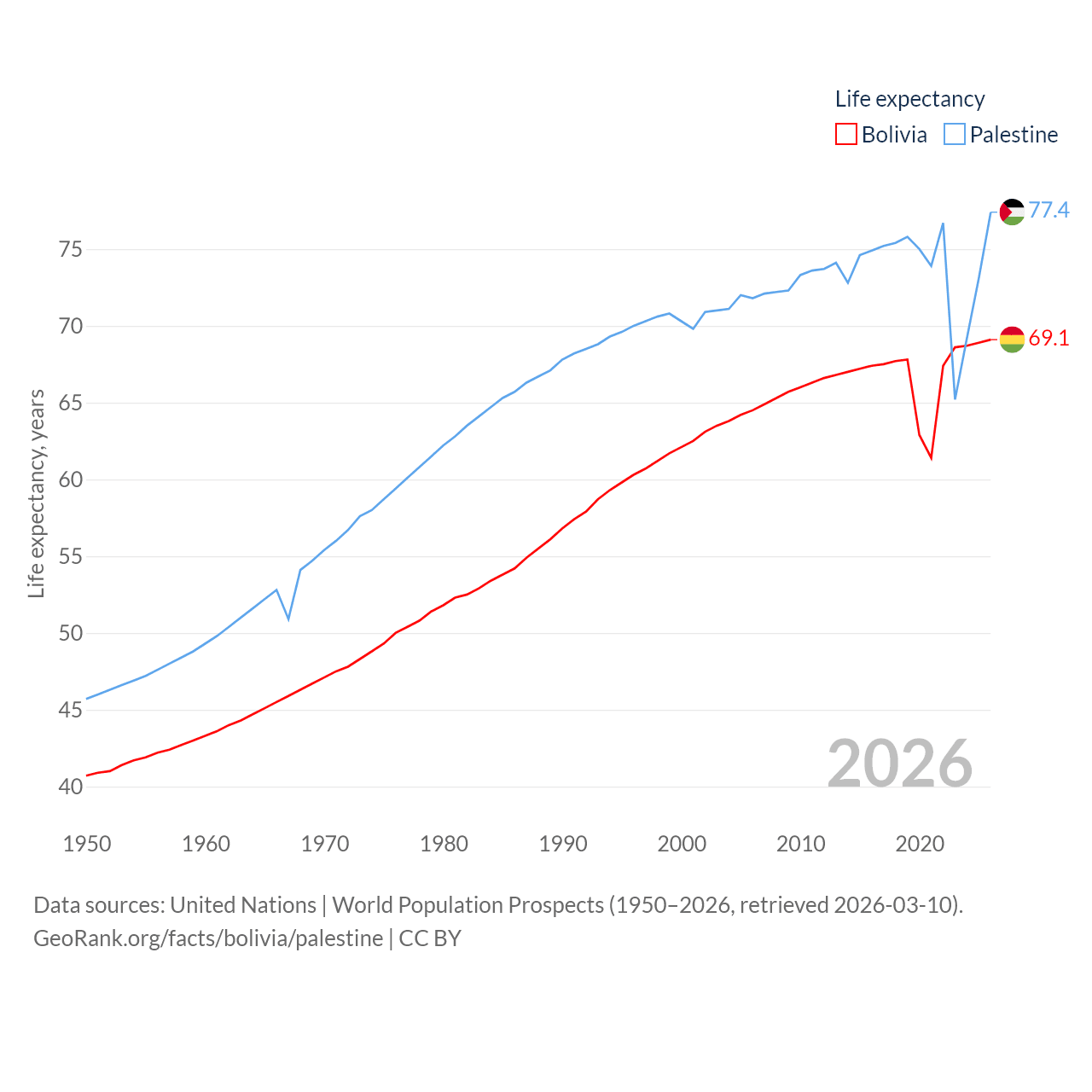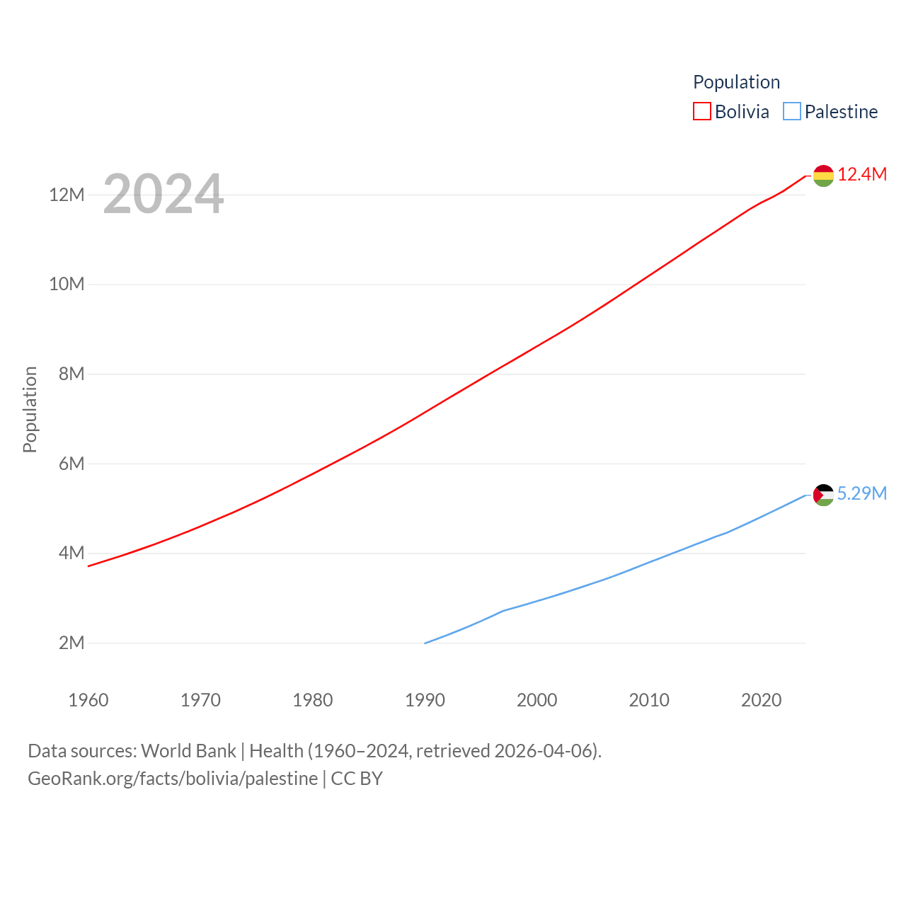 Bolivia has a population of 12.4M (ranked 79/197), compared with 5.29M in Palestine (ranked 122/197). Bolivia's land area is 418,264 sq mi versus 2,326 sq mi for Palestine (ranked 27th vs. 164th).
