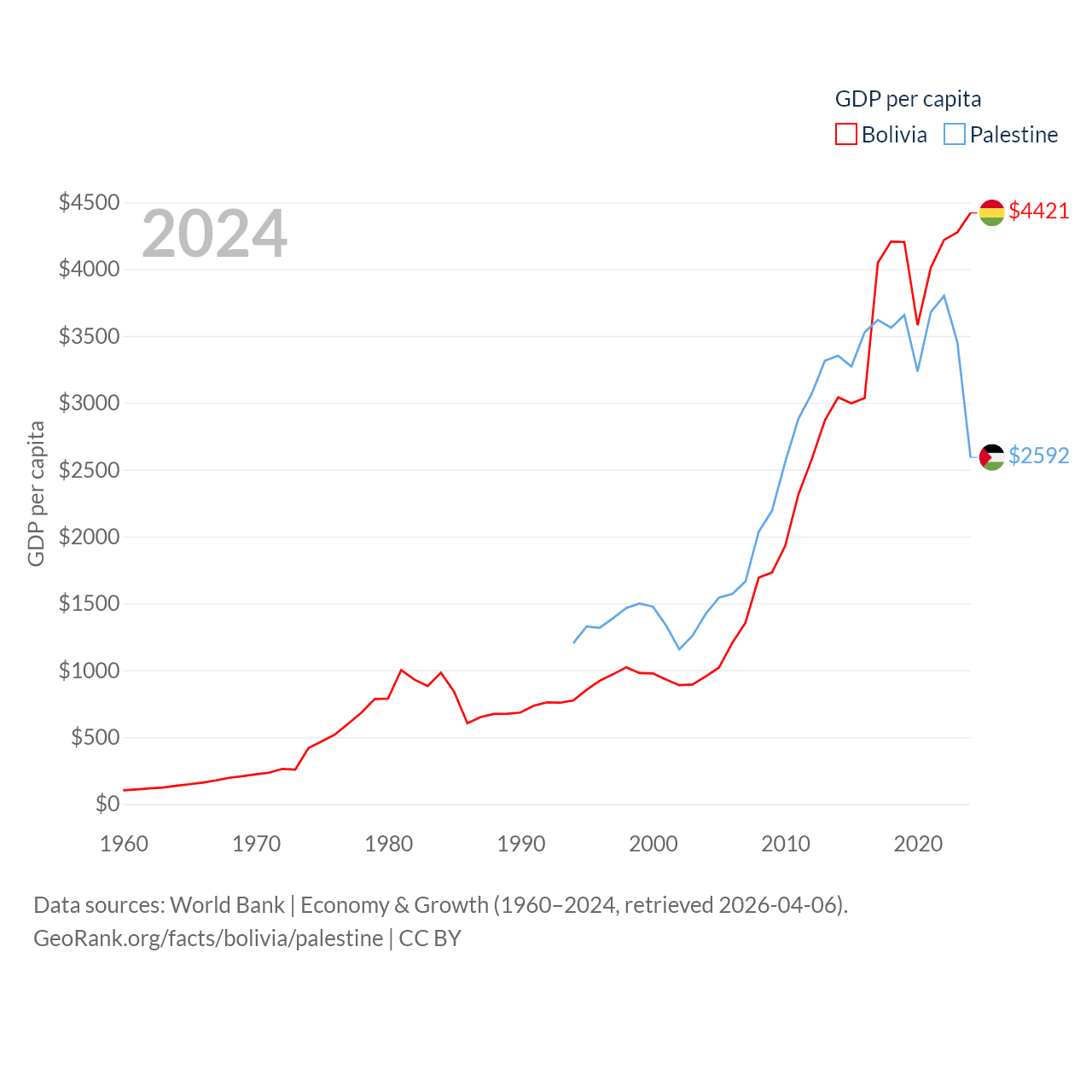 By GDP, Bolivia ranks 88/197 ($54.9B) and Palestine ranks 146/197 ($13.7B). By GDP per capita, Bolivia ranks 125/197 ($4,421), while Palestine ranks 147/197 ($2,592).