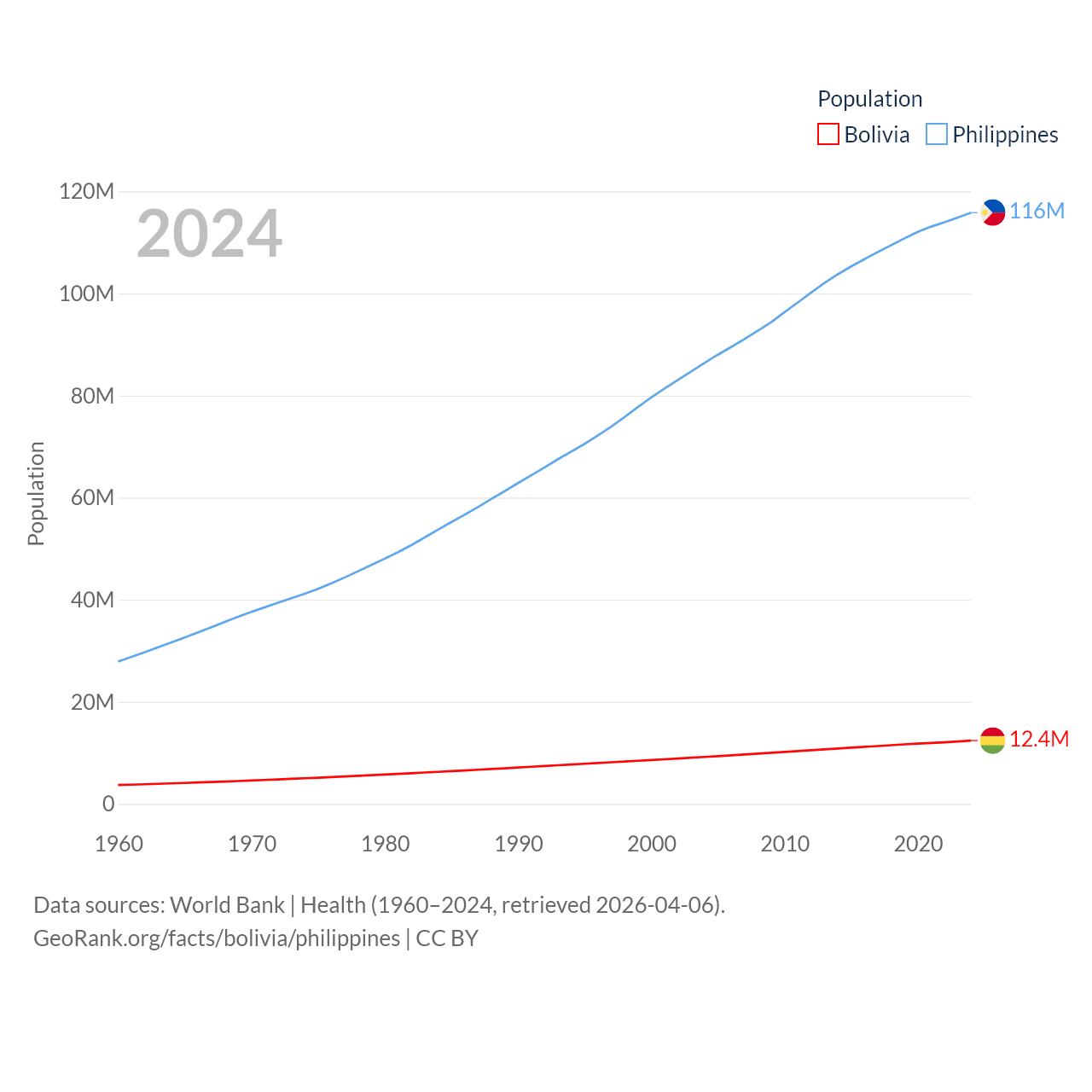 Bolivia has a population of 12.4M (ranked 79/197), compared with 116M in The Philippines (ranked 14/197). Bolivia's land area is 418,264 sq mi versus 115,124 sq mi for The Philippines (ranked 27th vs. 71st).