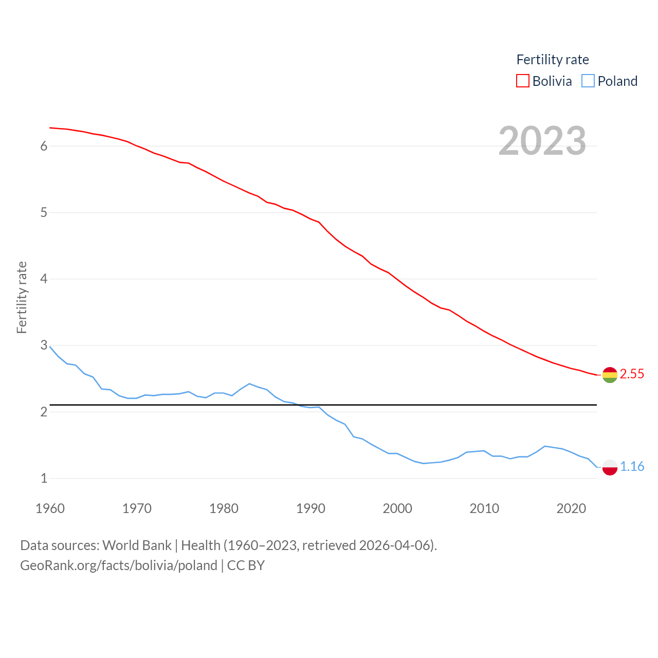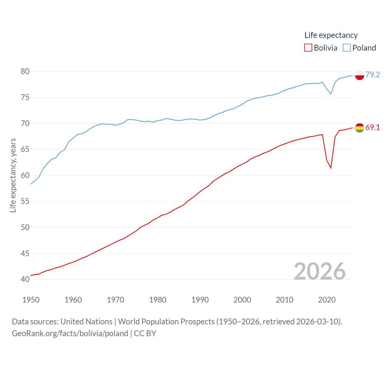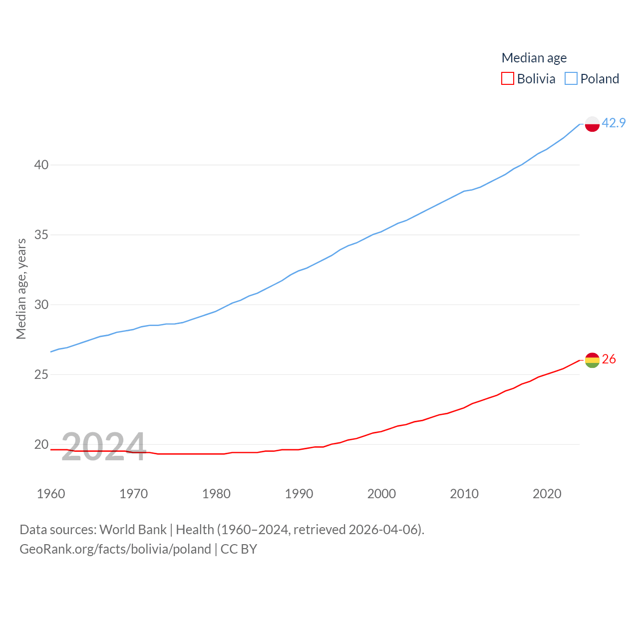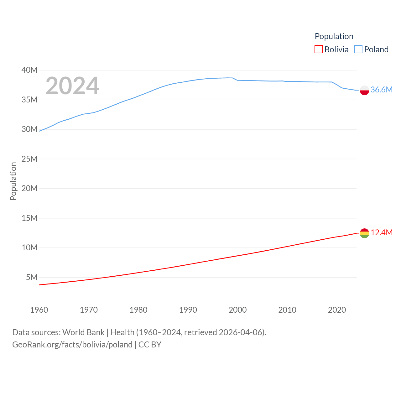 Bolivia has a population of 12.4M (ranked 79/197), compared with 36.6M in Poland (ranked 42/197). Bolivia's land area is 418,264 sq mi versus 118,252 sq mi for Poland (ranked 27th vs. 69th).