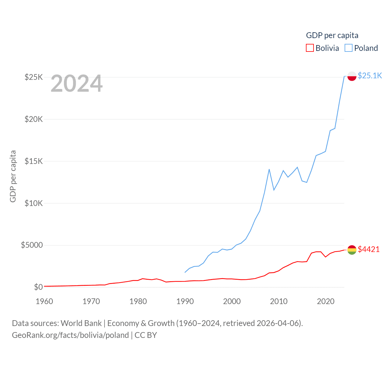 By GDP, Bolivia ranks 88/197 ($54.9B) and Poland ranks 21/197 ($918B). By GDP per capita, Bolivia ranks 125/197 ($4,421), while Poland ranks 48/197 ($25,104).
