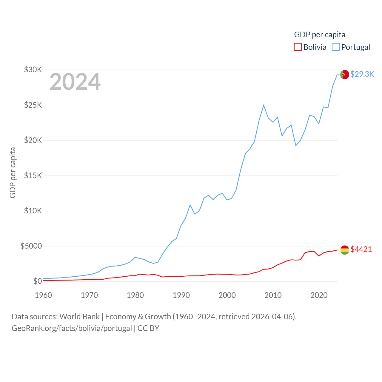 By GDP, Bolivia ranks 88/197 ($54.9B) and Portugal ranks 46/197 ($313B). By GDP per capita, Bolivia ranks 125/197 ($4,421), while Portugal ranks 44/197 ($29,292).