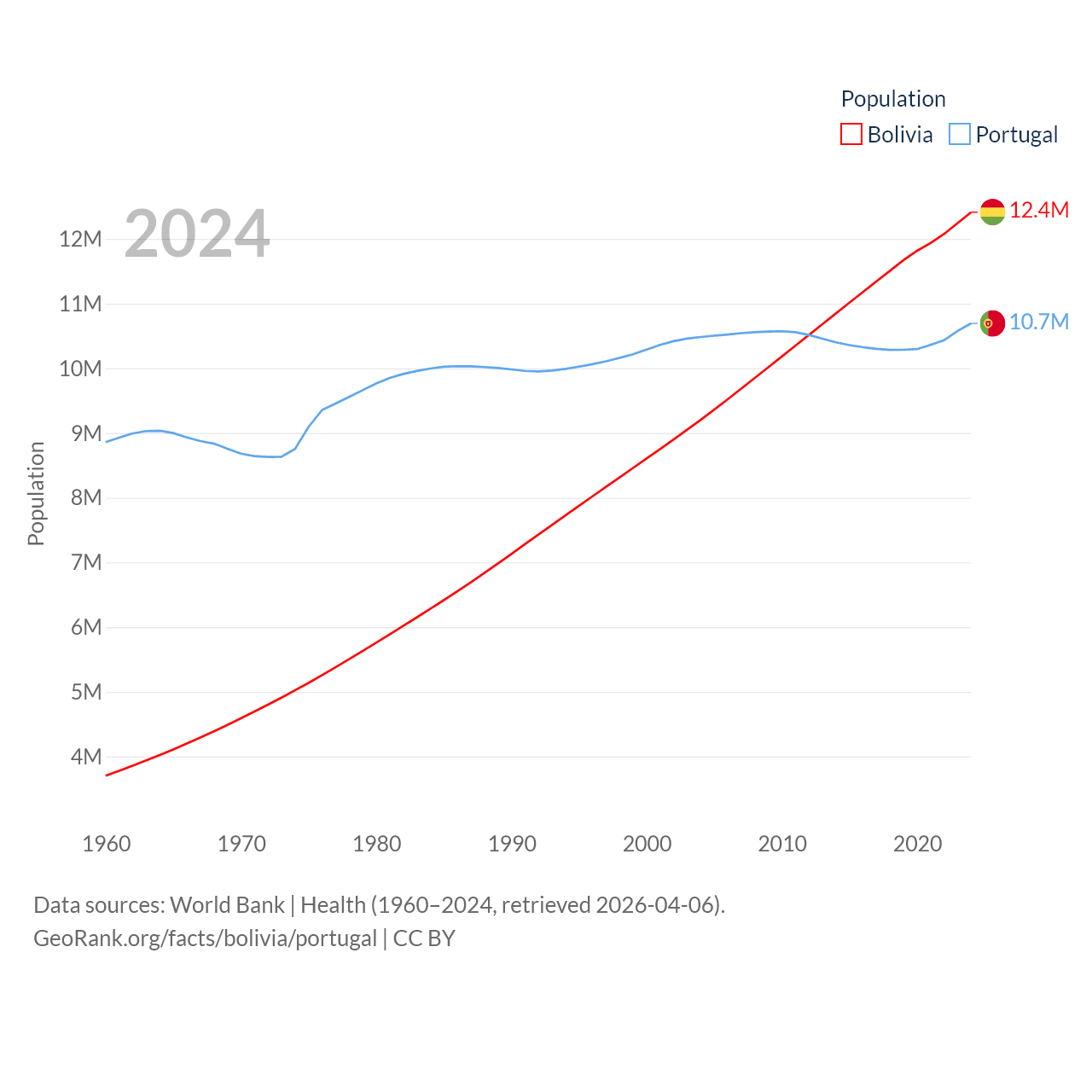 Bolivia has a population of 12.4M (ranked 79/197), compared with 10.7M in Portugal (ranked 90/197). Bolivia's land area is 418,264 sq mi versus 35,369 sq mi for Portugal (ranked 27th vs. 108th).