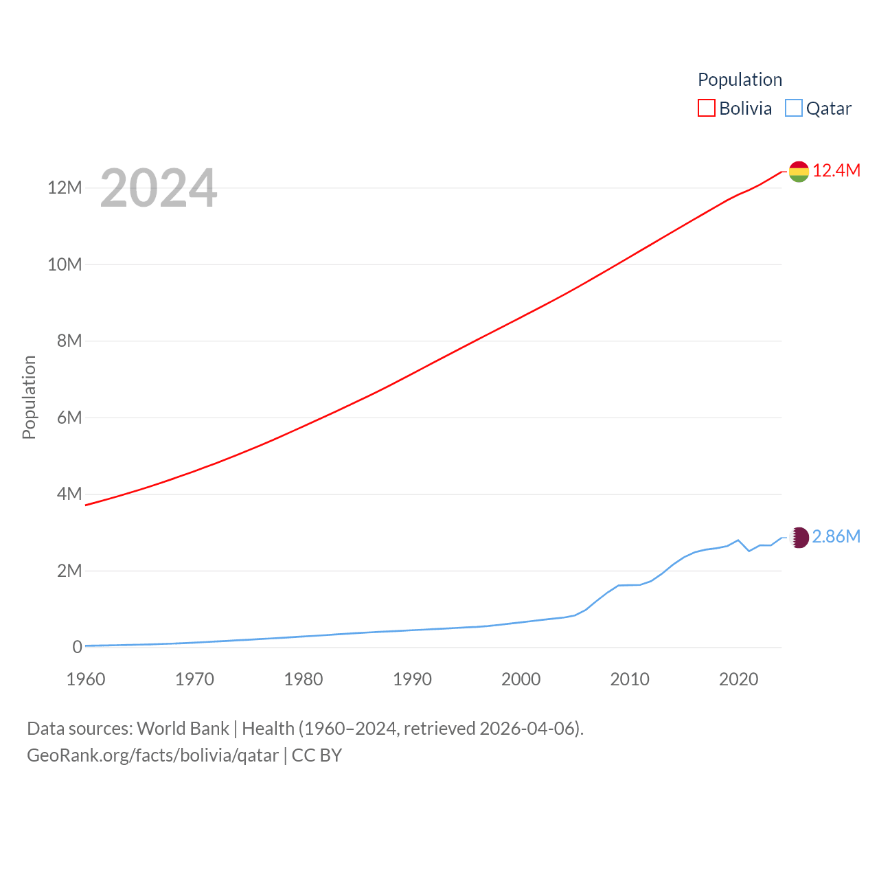 Bolivia has a population of 12.4M (ranked 79/197), compared with 2.86M in Qatar (ranked 138/197). Bolivia's land area is 418,264 sq mi versus 4,436 sq mi for Qatar (ranked 27th vs. 158th).