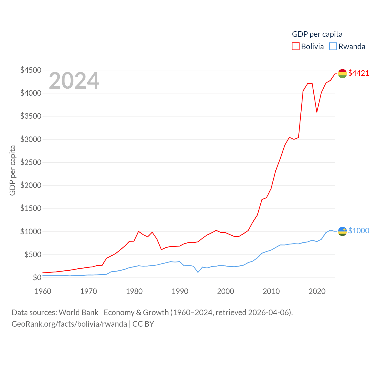 By GDP, Bolivia ranks 88/197 ($54.9B) and Rwanda ranks 144/197 ($14.3B). By GDP per capita, Bolivia ranks 125/197 ($4,421), while Rwanda ranks 178/197 ($1,000).