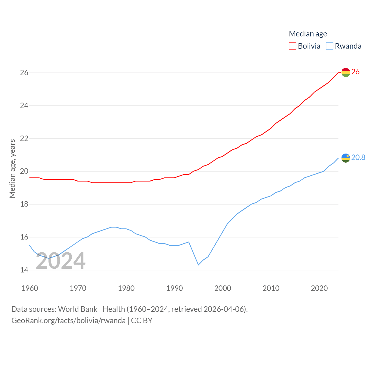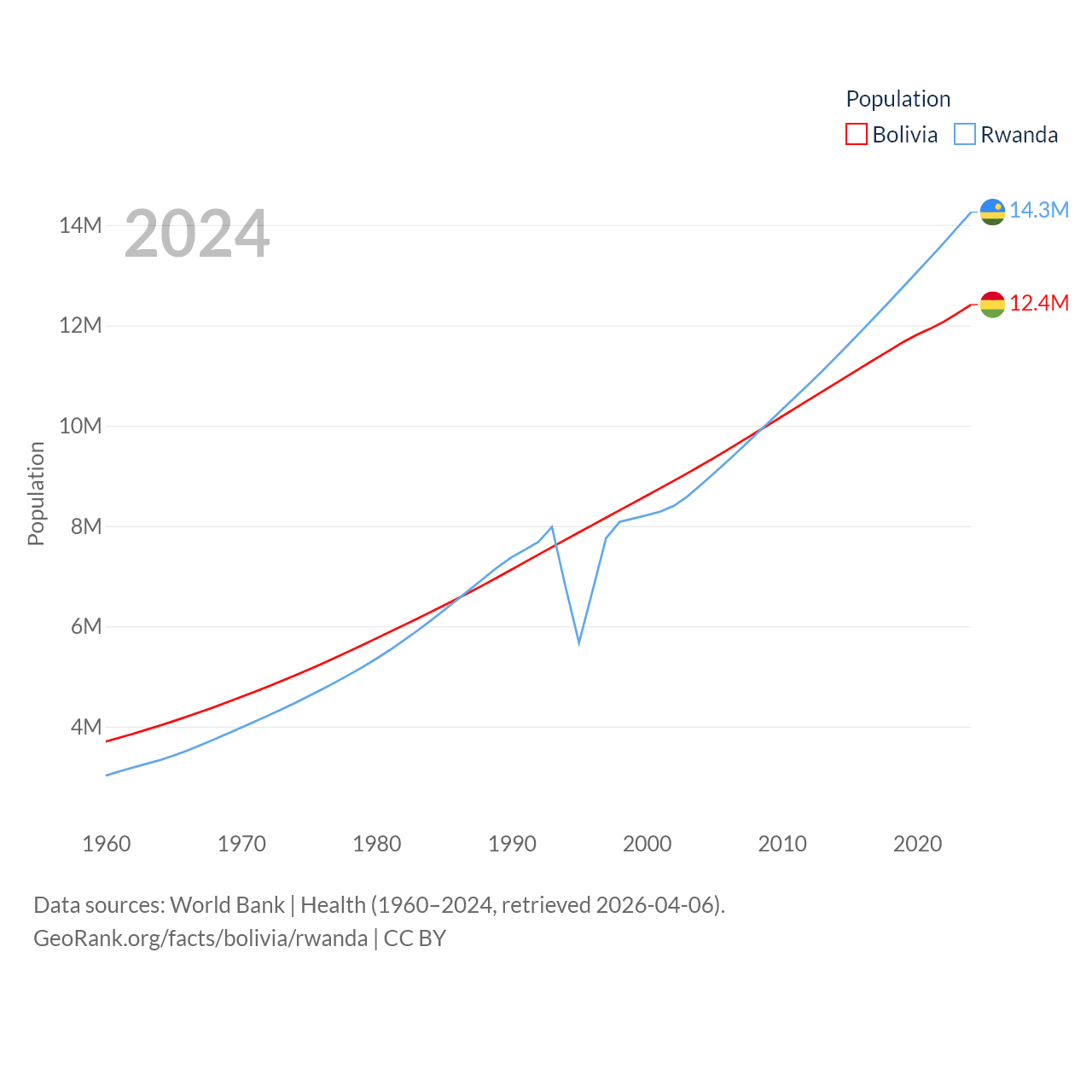 Bolivia has a population of 12.4M (ranked 79/197), compared with 14.3M in Rwanda (ranked 77/197). Bolivia's land area is 418,264 sq mi versus 9,525 sq mi for Rwanda (ranked 27th vs. 146th).