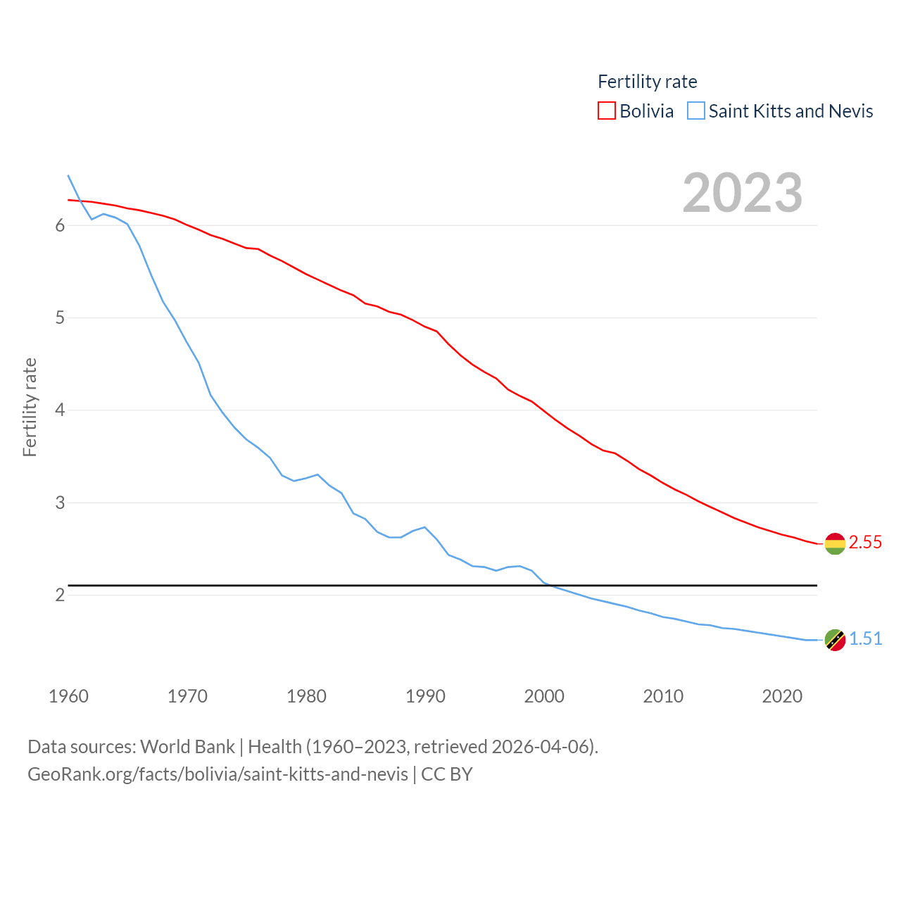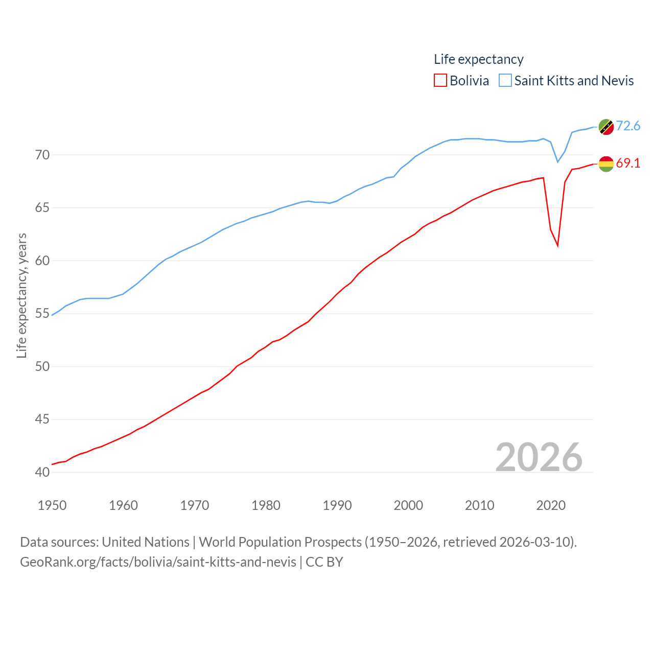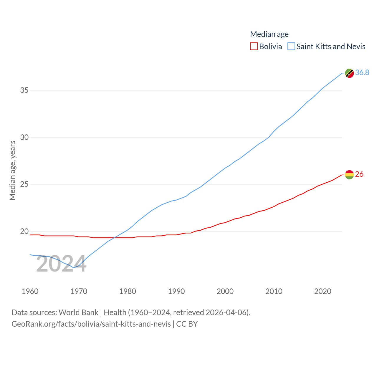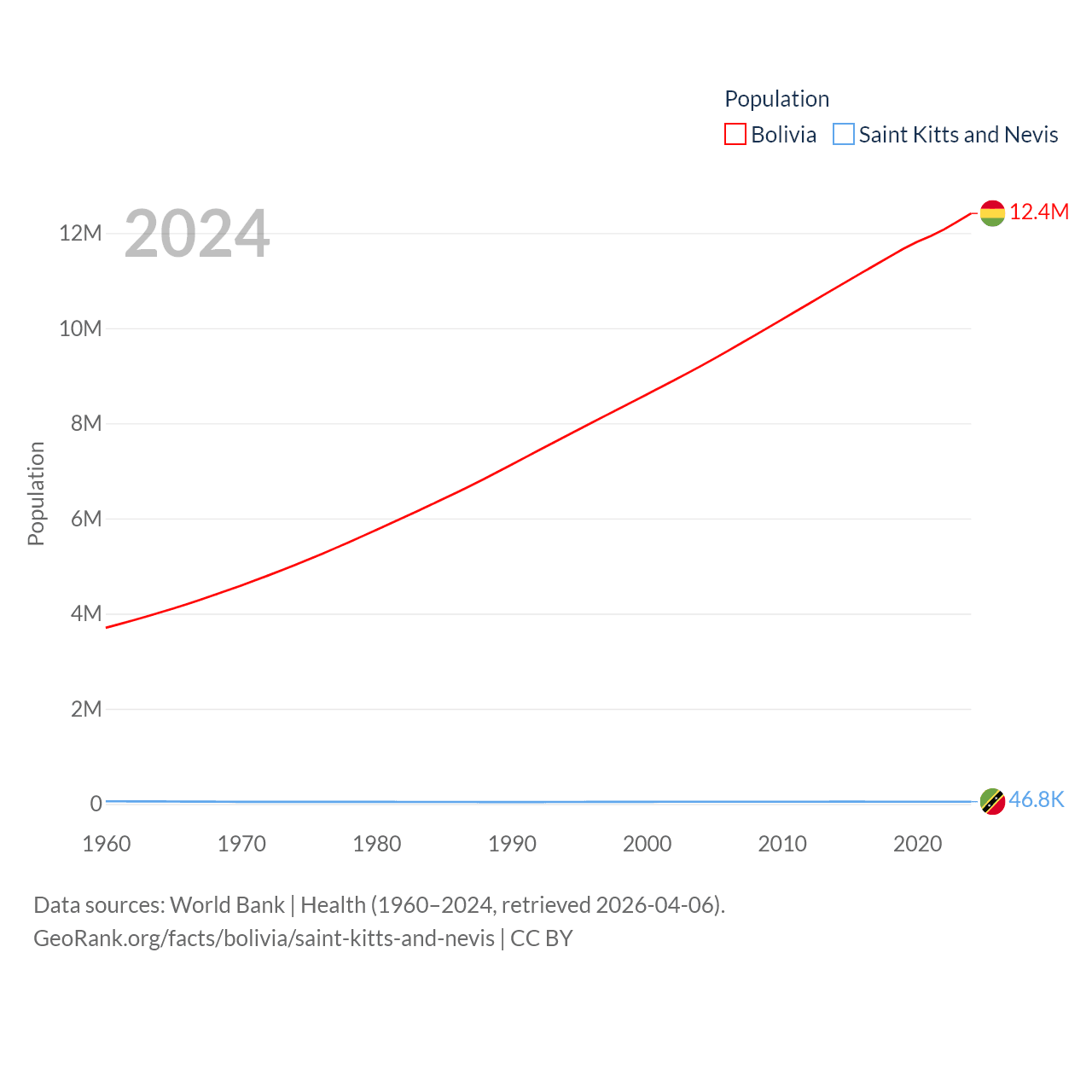 Bolivia has a population of 12.4M (ranked 79/197), compared with 46.8K in Saint Kitts and Nevis (ranked 189/197). Bolivia's land area is 418,264 sq mi versus 100.4 sq mi for Saint Kitts and Nevis (ranked 27th vs. 189th).