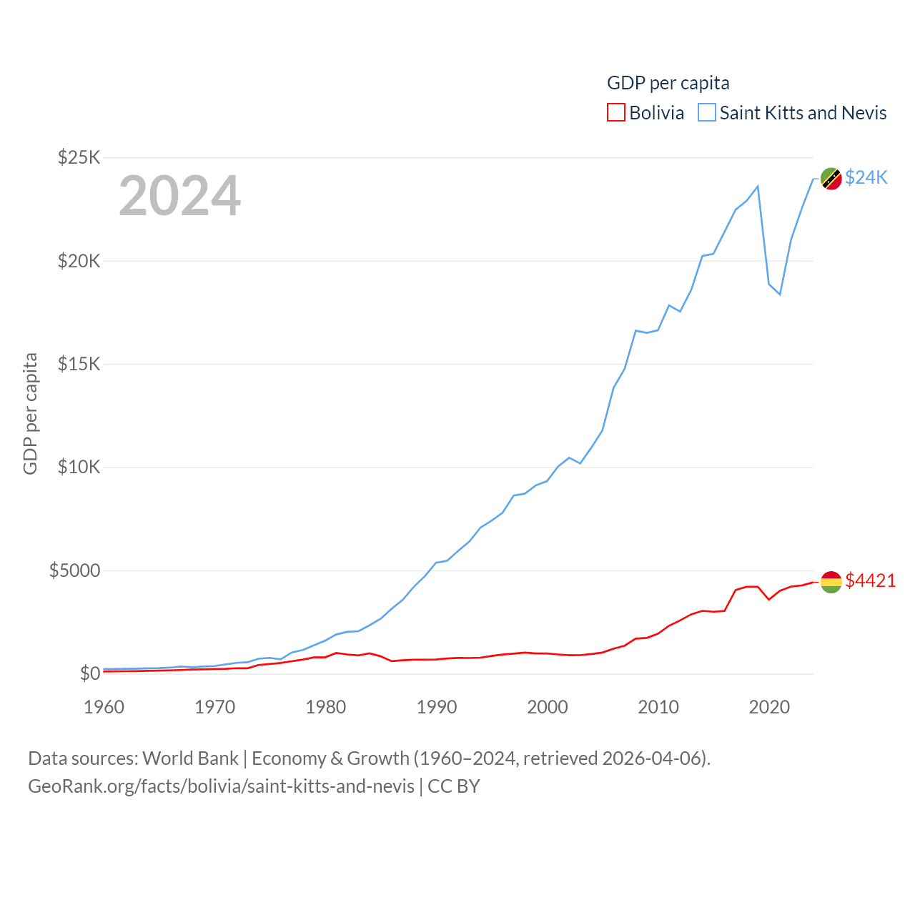By GDP, Bolivia ranks 88/197 ($54.9B) and Saint Kitts and Nevis ranks 187/197 ($1.12B). By GDP per capita, Bolivia ranks 125/197 ($4,421), while Saint Kitts and Nevis ranks 51/197 ($23,961).