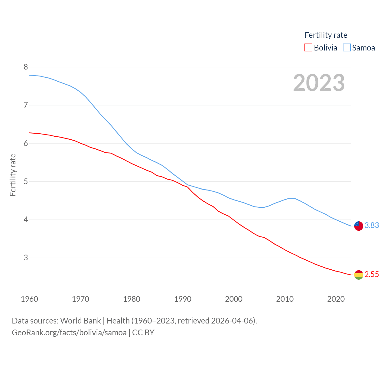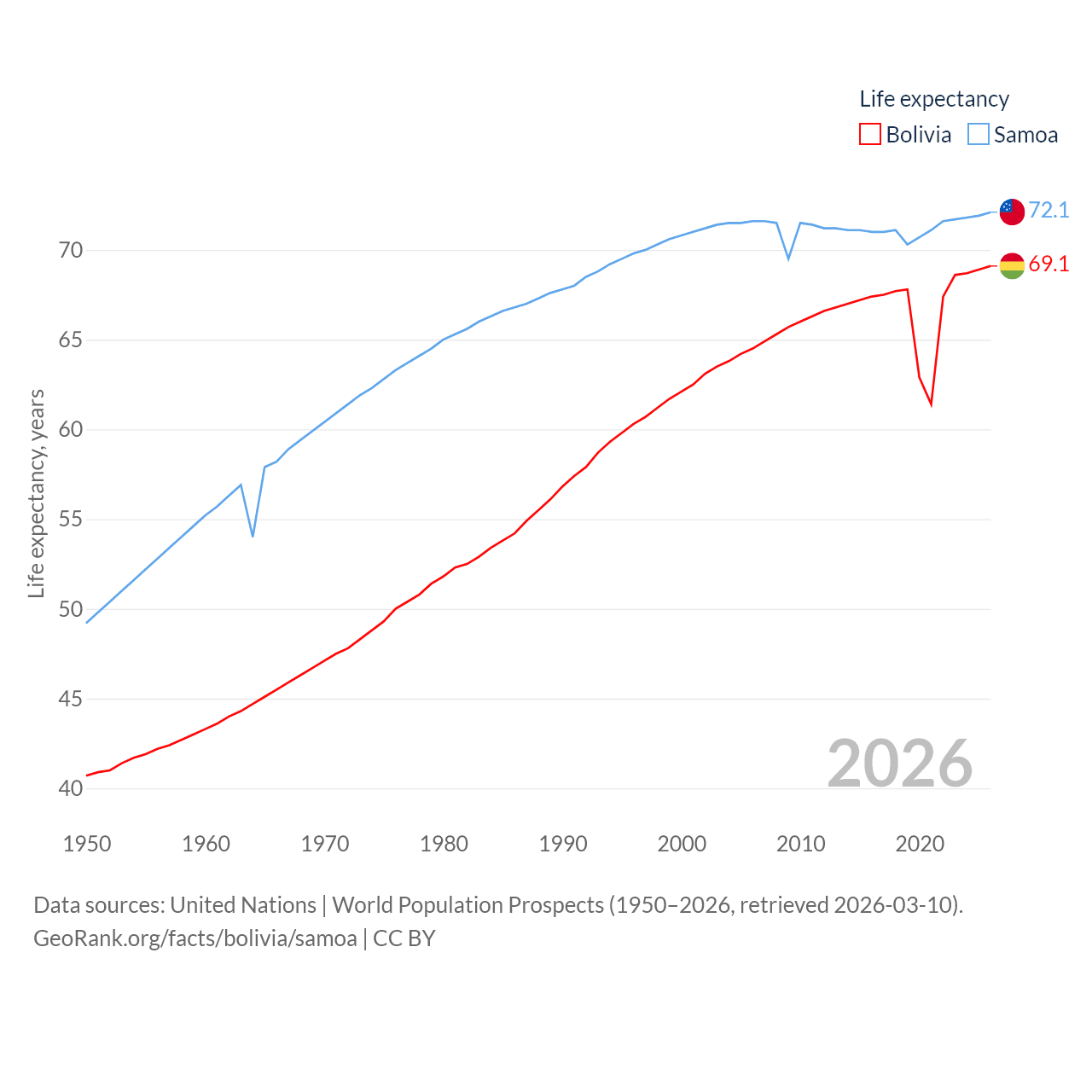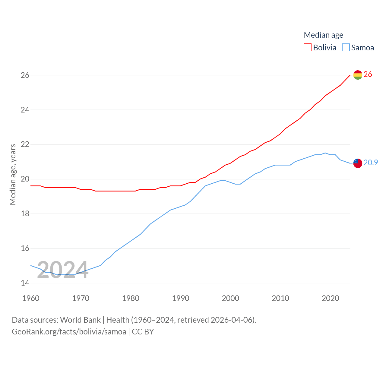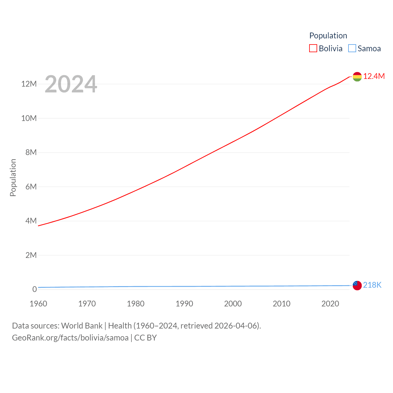 Bolivia has a population of 12.4M (ranked 79/197), compared with 218K in Samoa (ranked 177/197). Bolivia's land area is 418,264 sq mi versus 1,073 sq mi for Samoa (ranked 27th vs. 168th).