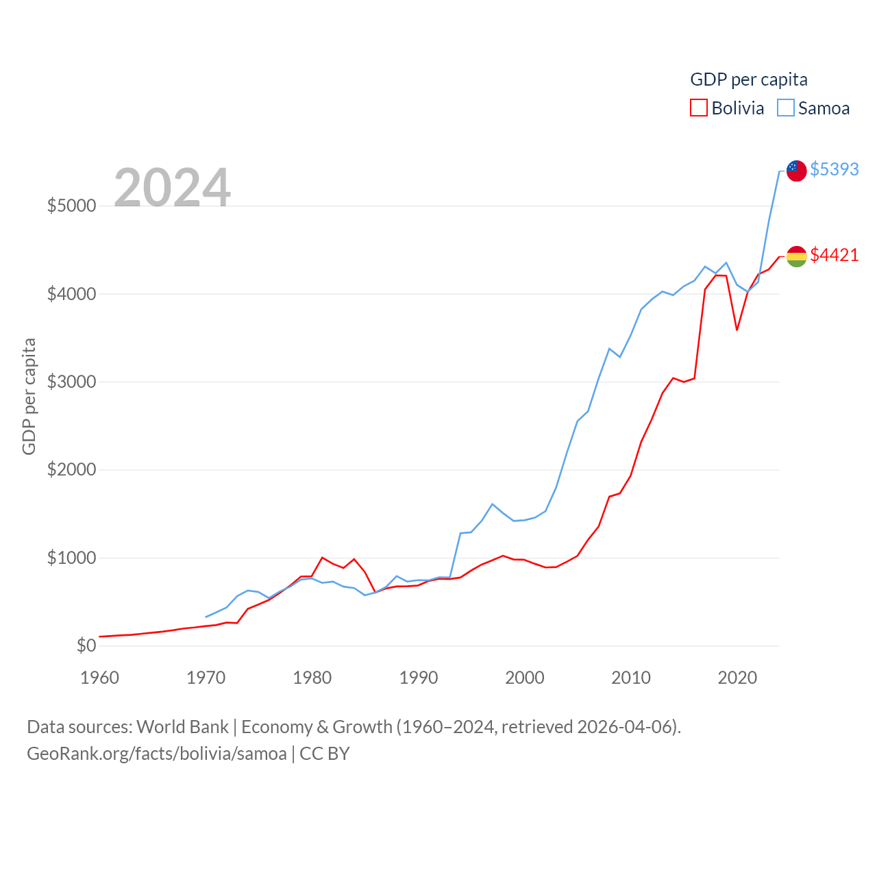 By GDP, Bolivia ranks 88/197 ($54.9B) and Samoa ranks 185/197 ($1.18B). By GDP per capita, Bolivia ranks 125/197 ($4,421), while Samoa ranks 117/197 ($5,393).