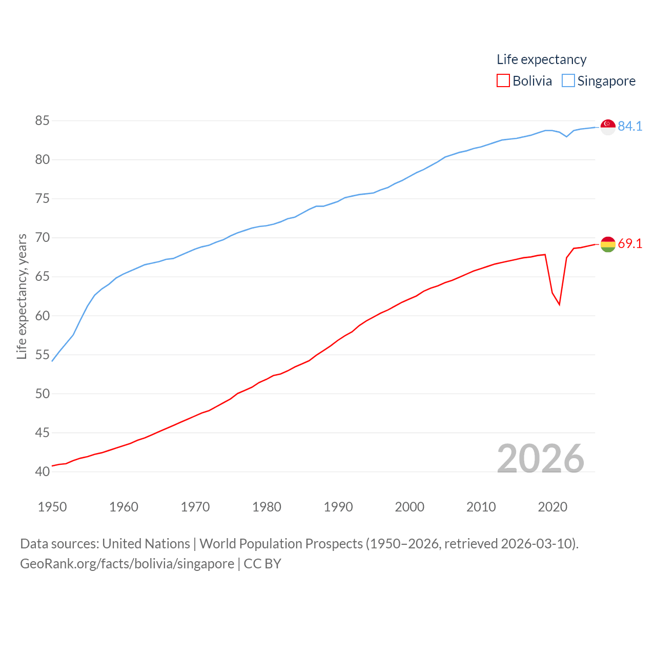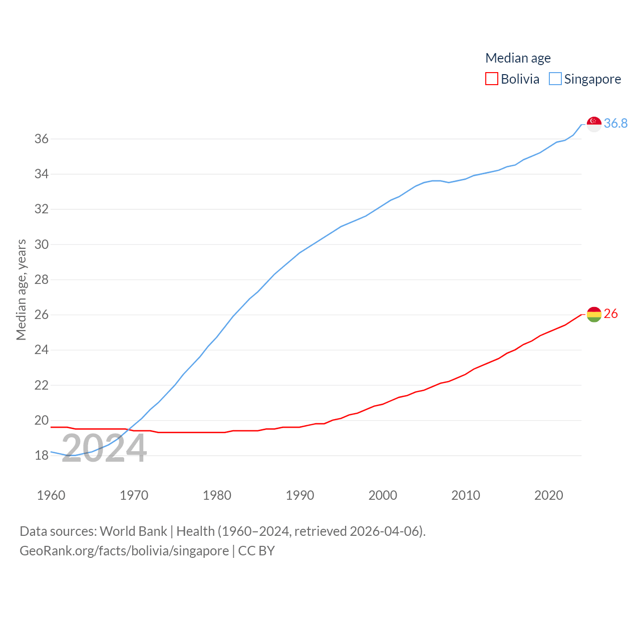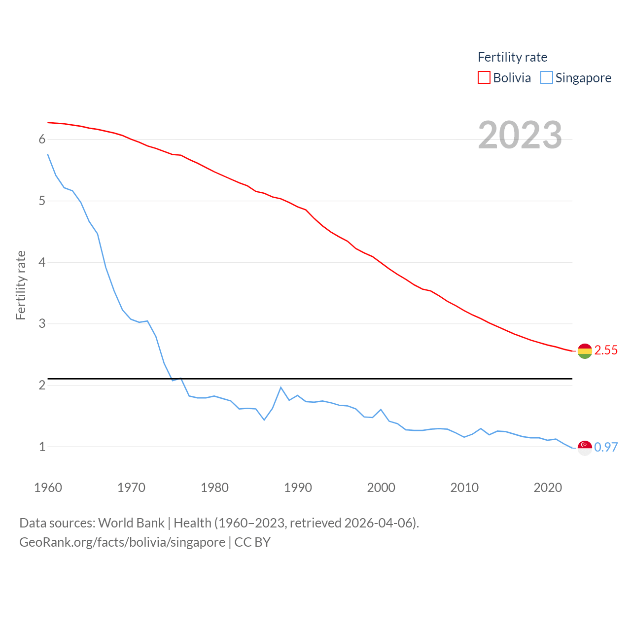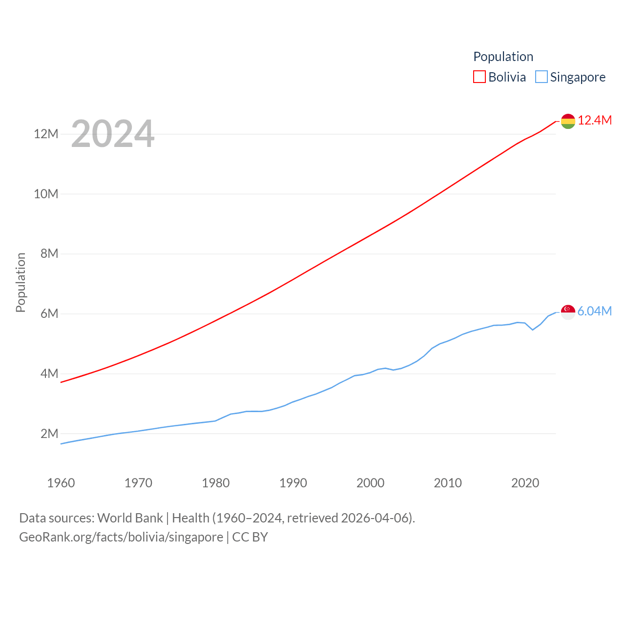 Bolivia has a population of 12.4M (ranked 79/197), compared with 6.04M in Singapore (ranked 113/197). Bolivia's land area is 418,264 sq mi versus 277.2 sq mi for Singapore (ranked 27th vs. 177th).
