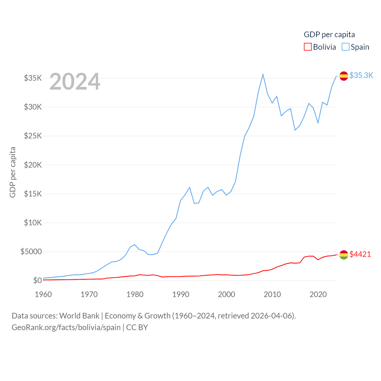 By GDP, Bolivia ranks 88/197 ($54.9B) and Spain ranks 15/197 ($1.73T). By GDP per capita, Bolivia ranks 125/197 ($4,421), while Spain ranks 32/197 ($35,327).
