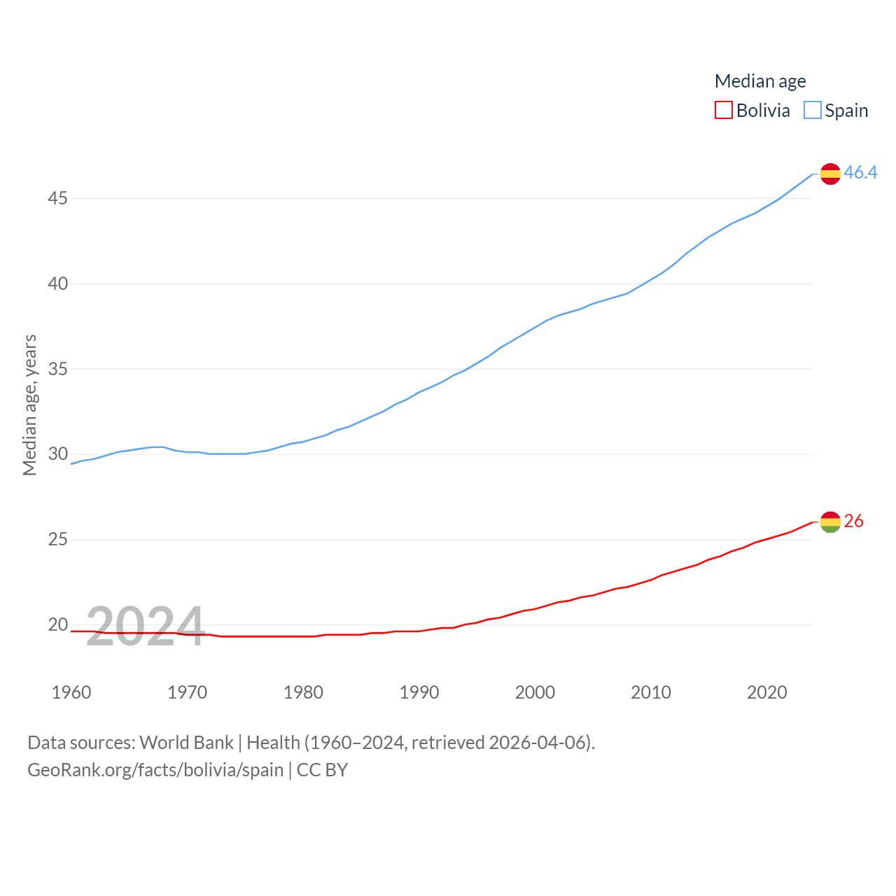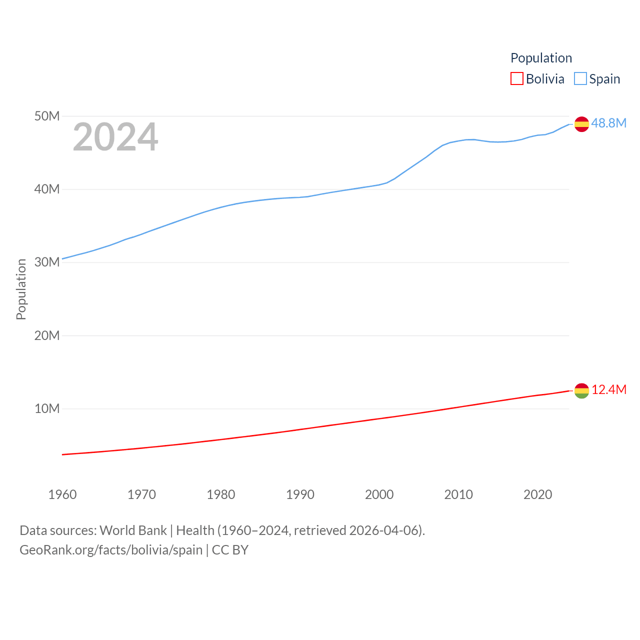 Bolivia has a population of 12.4M (ranked 79/197), compared with 48.8M in Spain (ranked 32/197). Bolivia's land area is 418,264 sq mi versus 192,934 sq mi for Spain (ranked 27th vs. 51st).