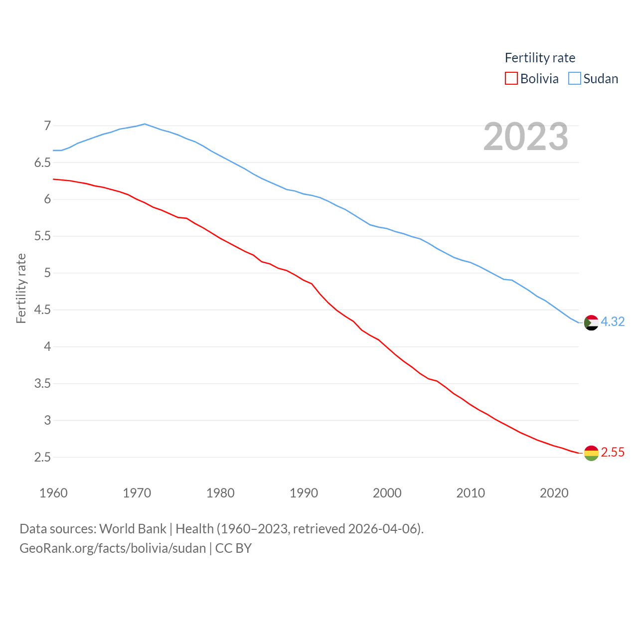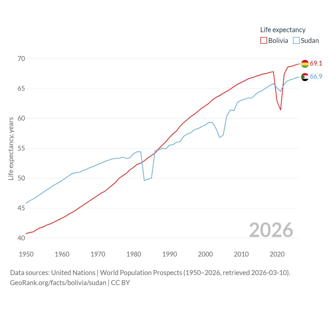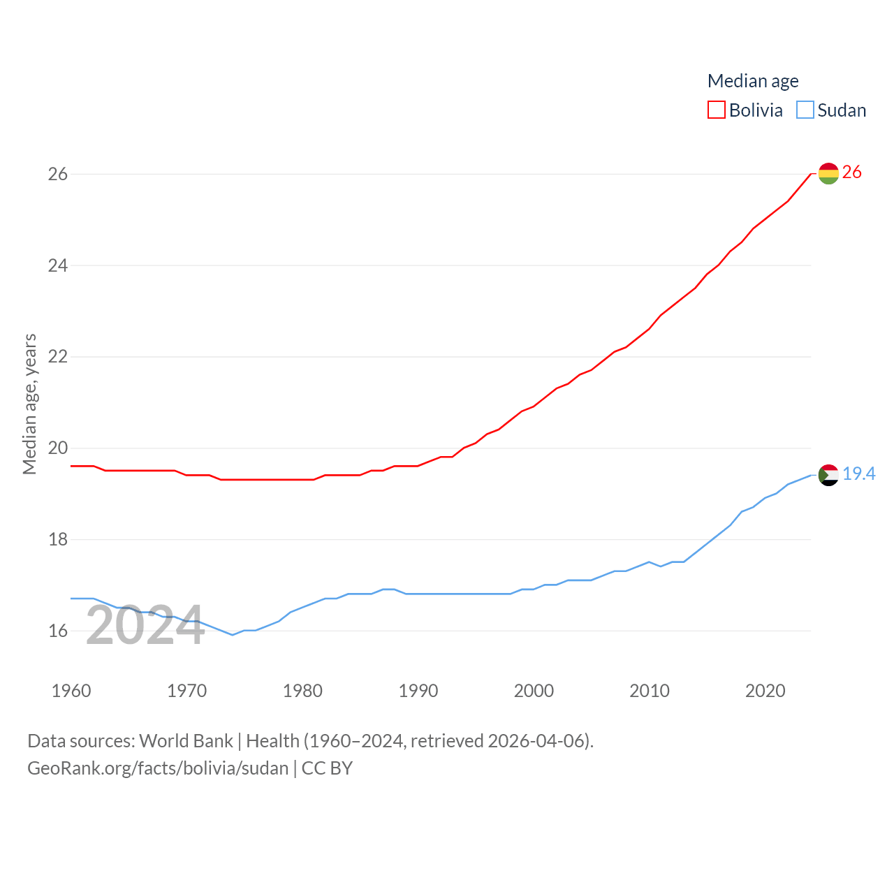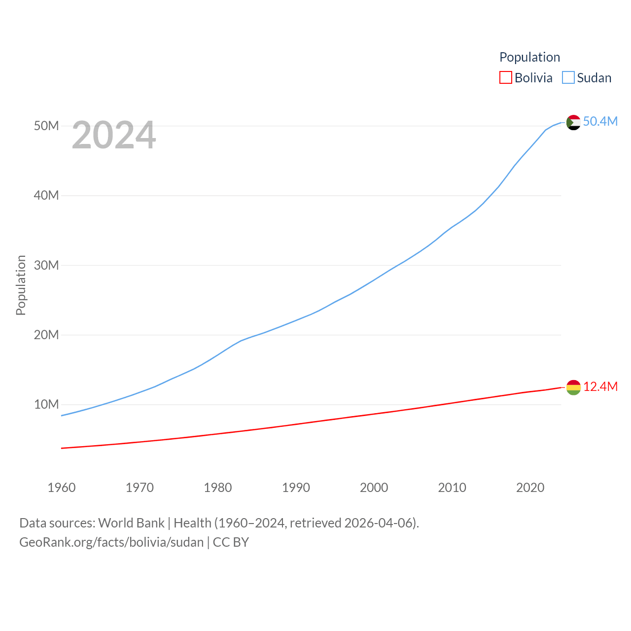 Bolivia has a population of 12.4M (ranked 79/197), compared with 50.4M in Sudan (ranked 30/197). Bolivia's land area is 418,264 sq mi versus 721,239 sq mi for Sudan (ranked 27th vs. 15th).
