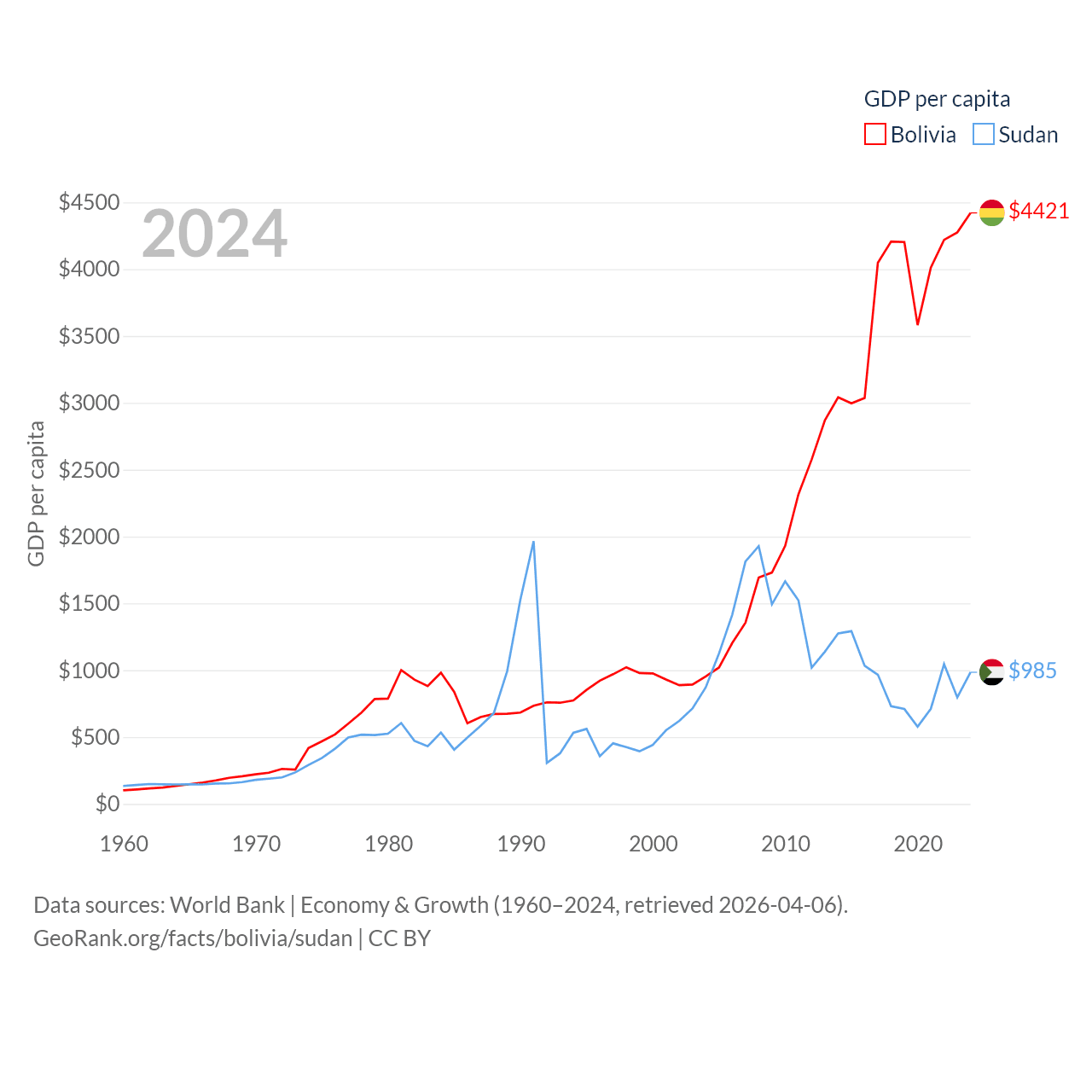 By GDP, Bolivia ranks 88/197 ($54.9B) and Sudan ranks 94/197 ($49.7B). By GDP per capita, Bolivia ranks 125/197 ($4,421), while Sudan ranks 179/197 ($985).
