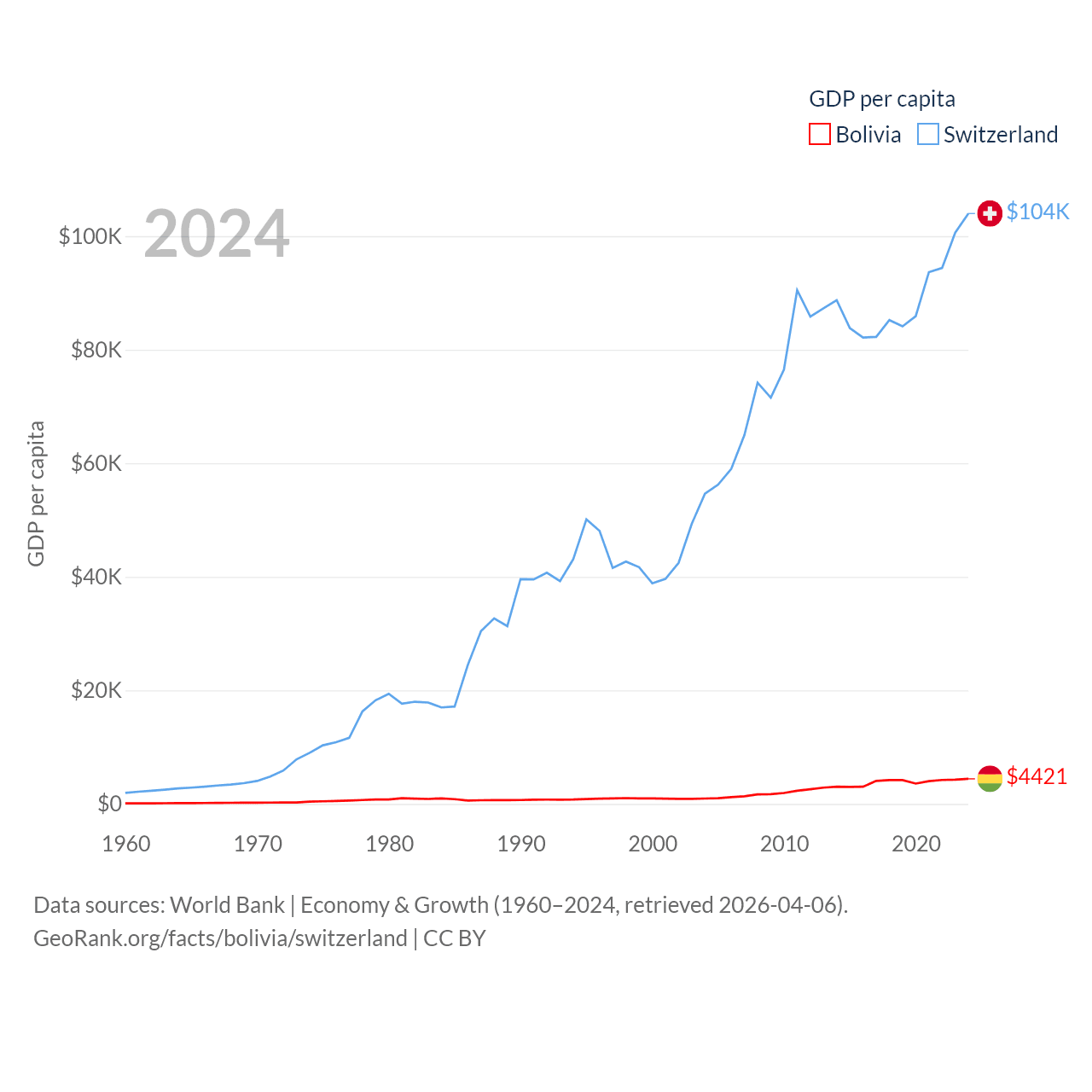By GDP, Bolivia ranks 88/197 ($54.9B) and Switzerland ranks 20/197 ($937B). By GDP per capita, Bolivia ranks 125/197 ($4,421), while Switzerland ranks 5/197 ($103,998).