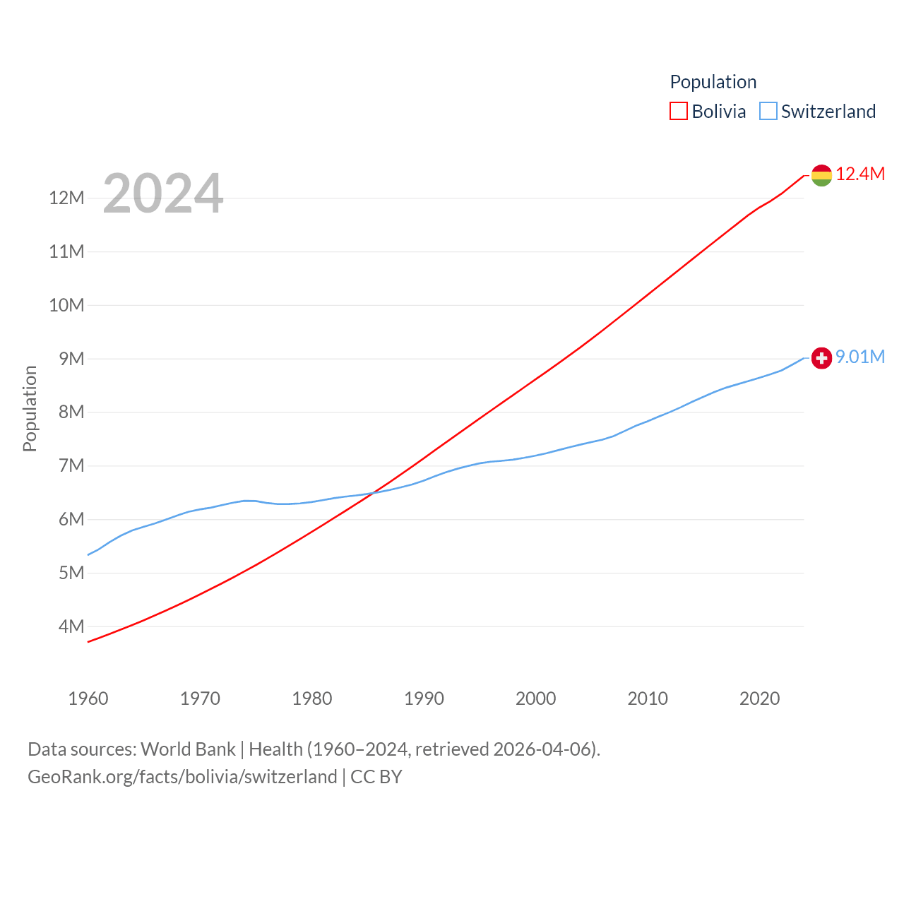 Bolivia has a population of 12.4M (ranked 79/197), compared with 9.01M in Switzerland (ranked 101/197). Bolivia's land area is 418,264 sq mi versus 15,255 sq mi for Switzerland (ranked 27th vs. 131st).