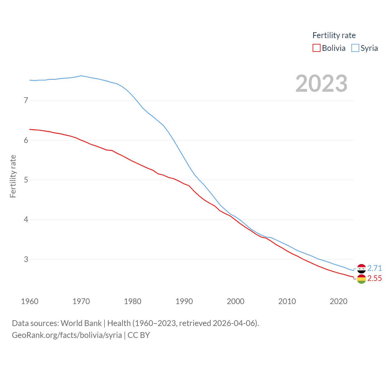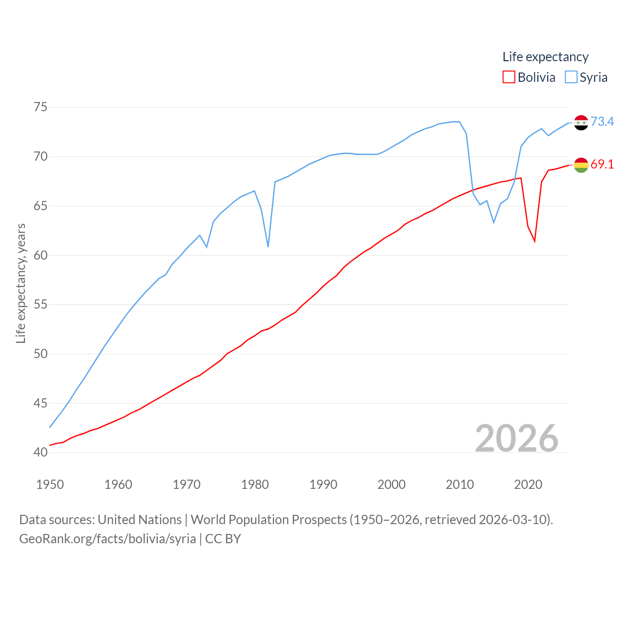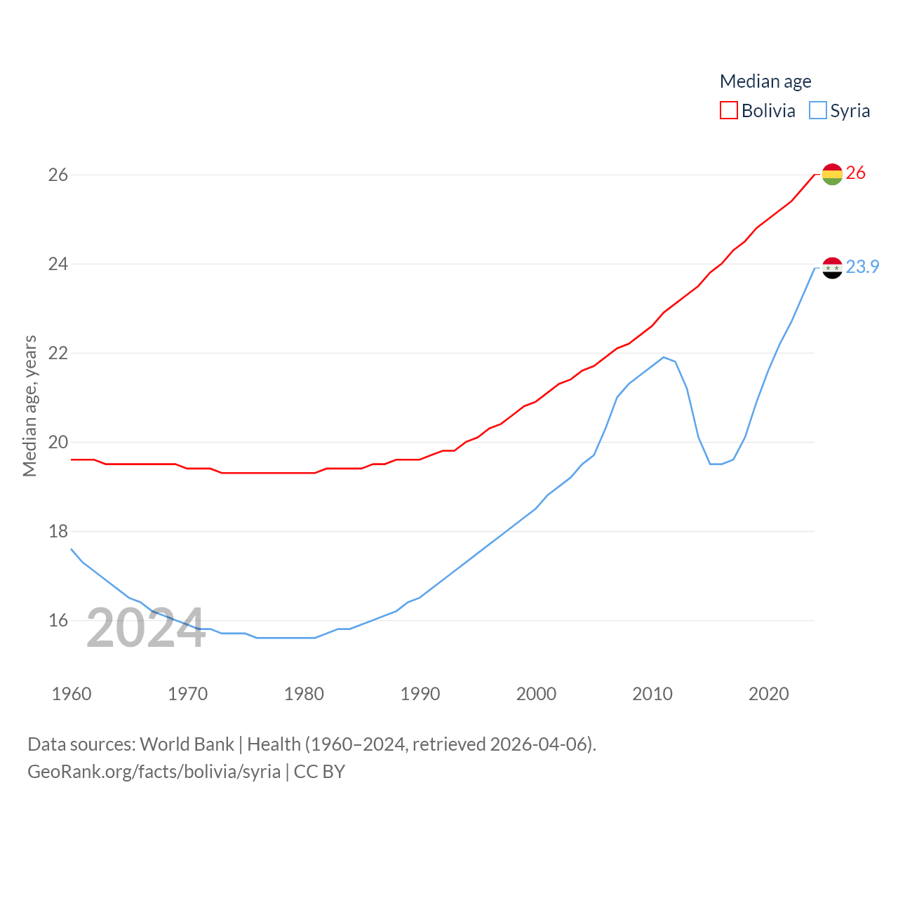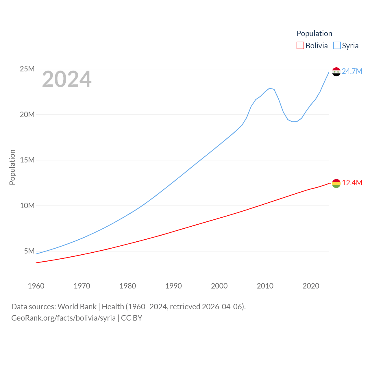 Bolivia has a population of 12.4M (ranked 79/197), compared with 24.7M in Syria (ranked 57/197). Bolivia's land area is 418,264 sq mi versus 70,900 sq mi for Syria (ranked 27th vs. 87th).
