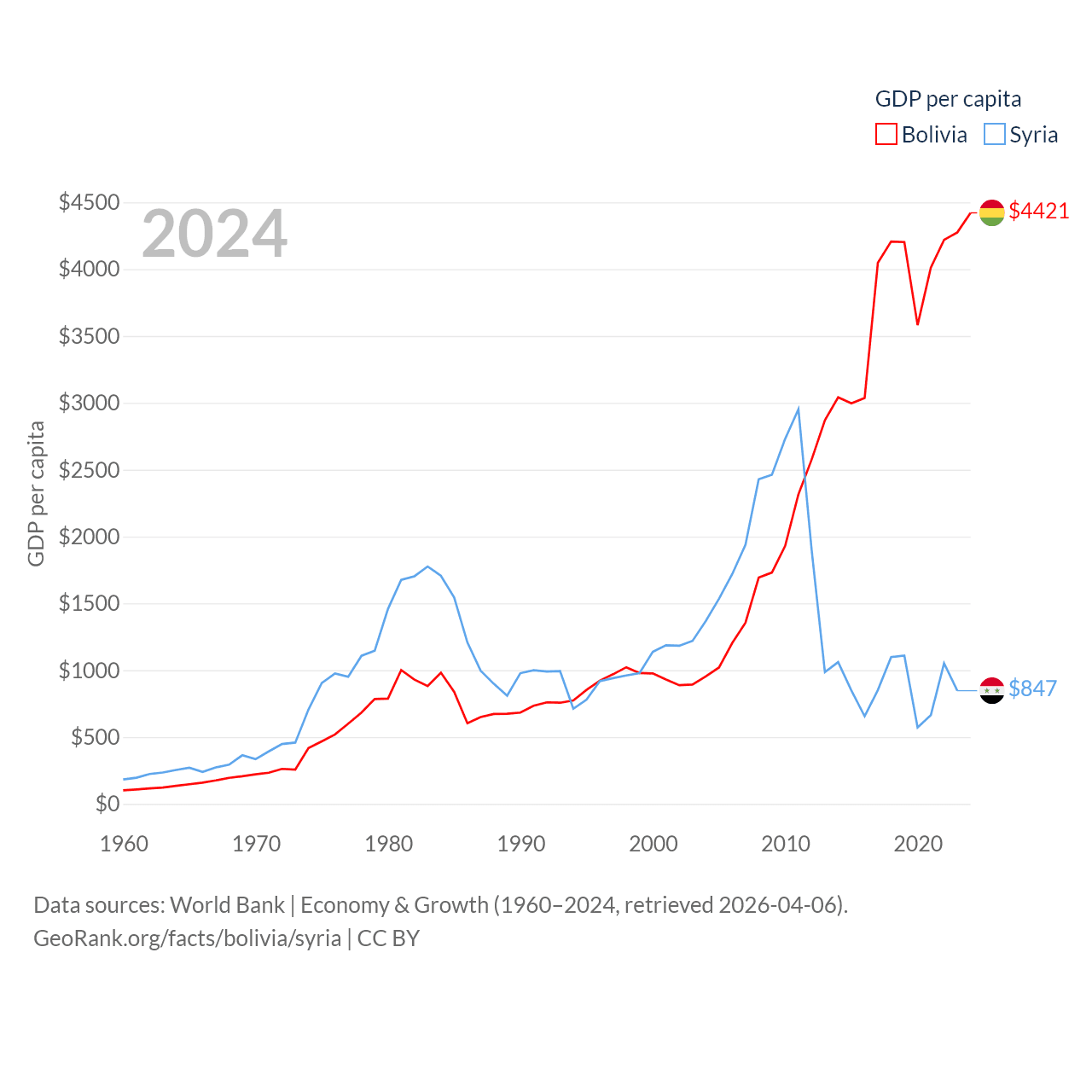 By GDP, Bolivia ranks 88/197 ($54.9B) and Syria ranks 129/197 ($20B). By GDP per capita, Bolivia ranks 125/197 ($4,421), while Syria ranks 185/197 ($847).