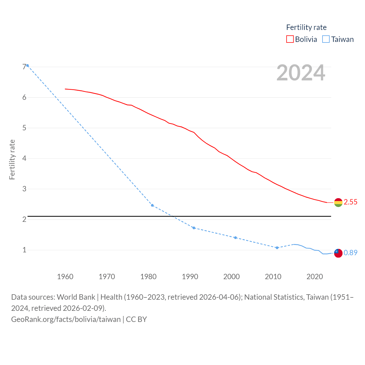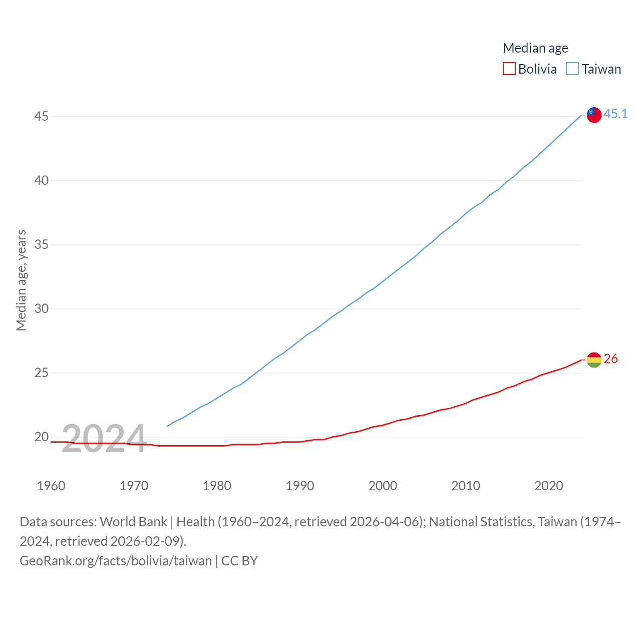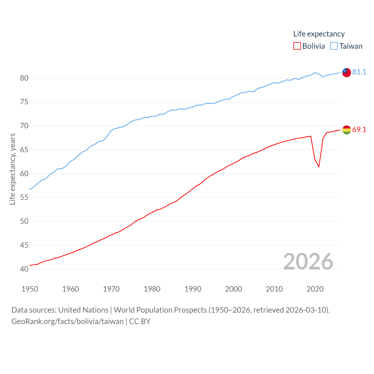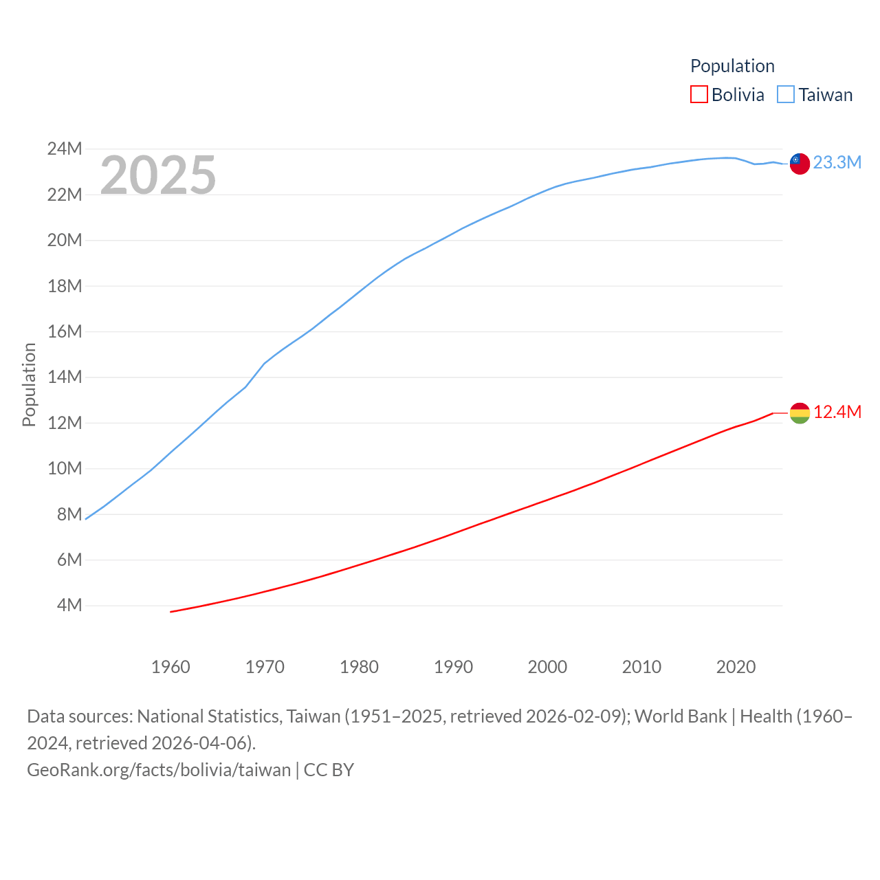 Bolivia has a population of 12.4M (ranked 79/197), compared with 23.3M in Taiwan (ranked 60/197). Bolivia's land area is 418,264 sq mi versus 13,976 sq mi for Taiwan (ranked 27th vs. 133rd).