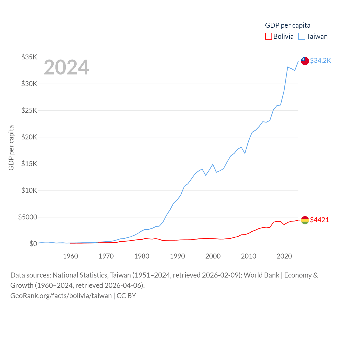 By GDP, Bolivia ranks 88/197 ($54.9B) and Taiwan ranks 22/197 ($802B). By GDP per capita, Bolivia ranks 125/197 ($4,421), while Taiwan ranks 35/197 ($34,238).