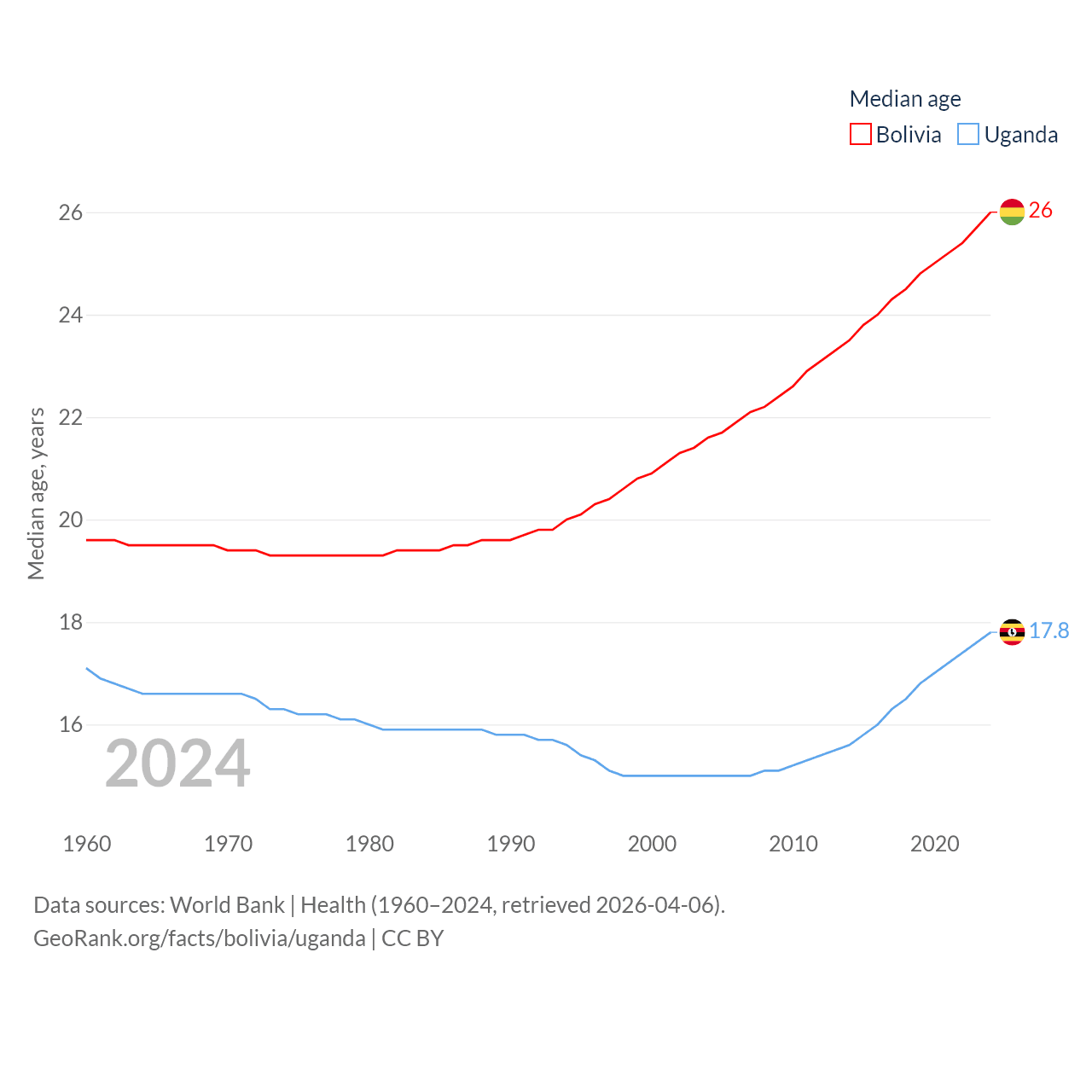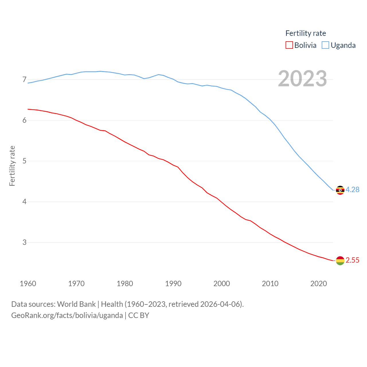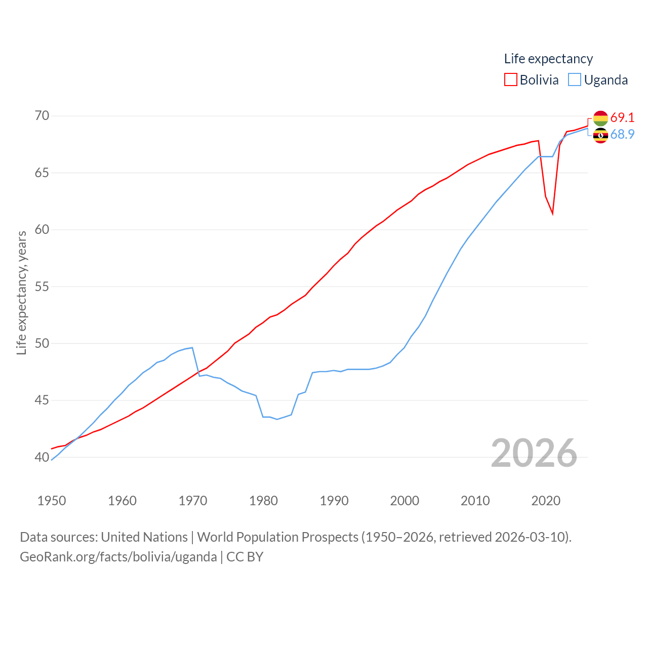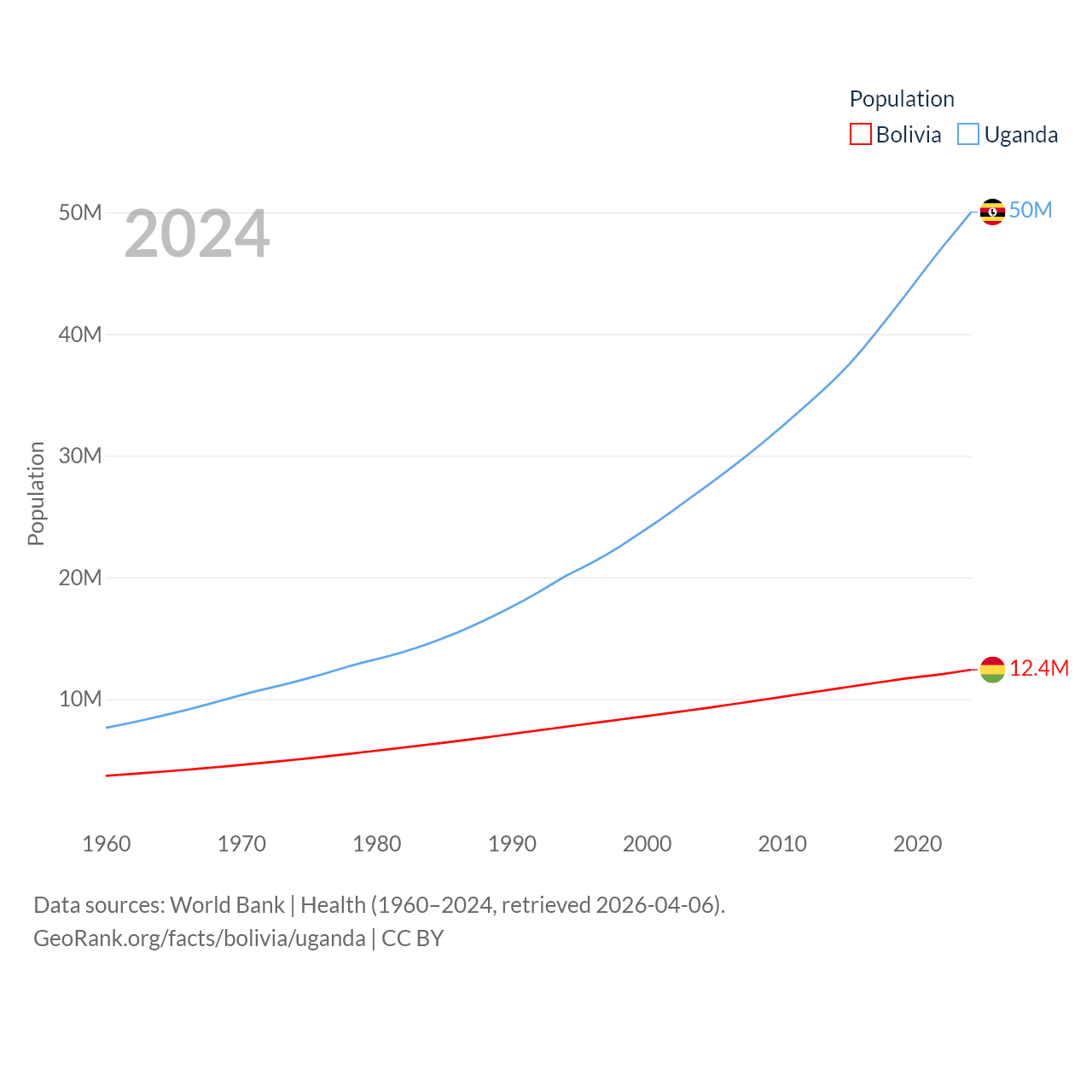 Bolivia has a population of 12.4M (ranked 79/197), compared with 50M in Uganda (ranked 31/197). Bolivia's land area is 418,264 sq mi versus 77,421 sq mi for Uganda (ranked 27th vs. 84th).