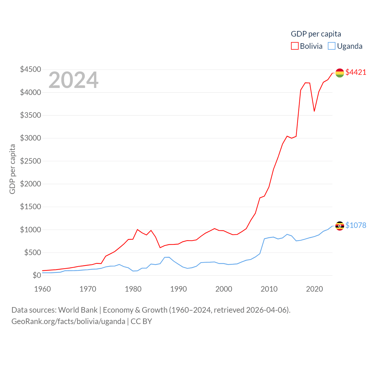 By GDP, Bolivia ranks 88/197 ($54.9B) and Uganda ranks 89/197 ($53.9B). By GDP per capita, Bolivia ranks 125/197 ($4,421), while Uganda ranks 176/197 ($1,078).