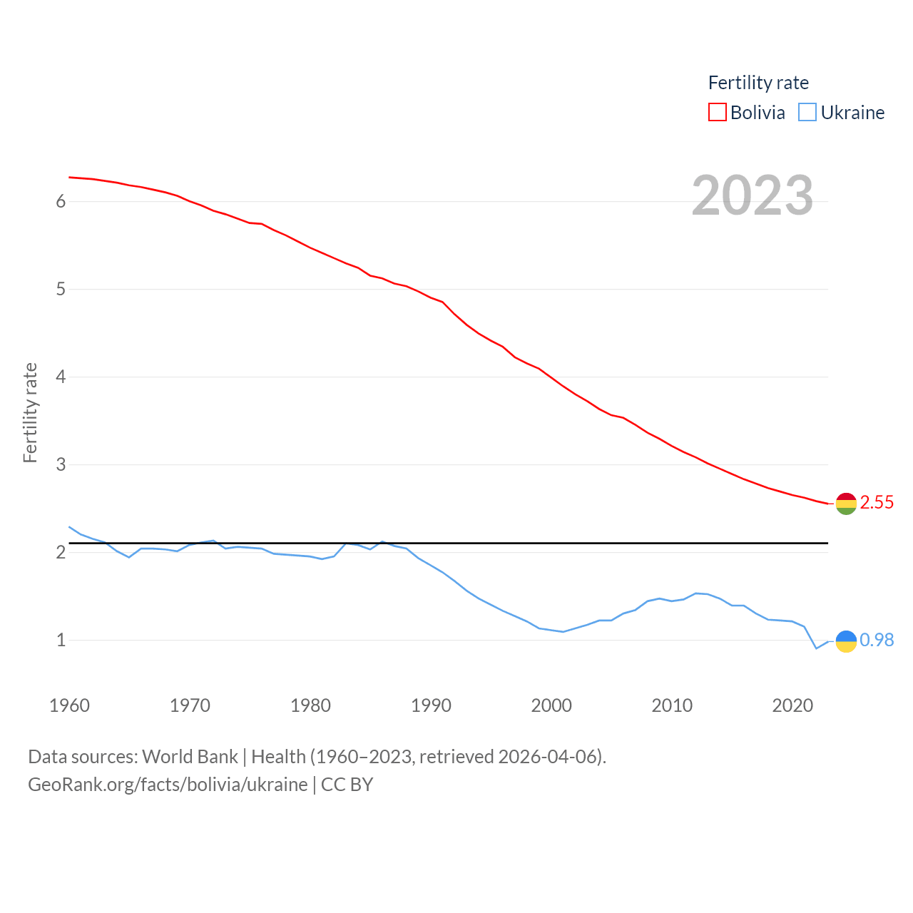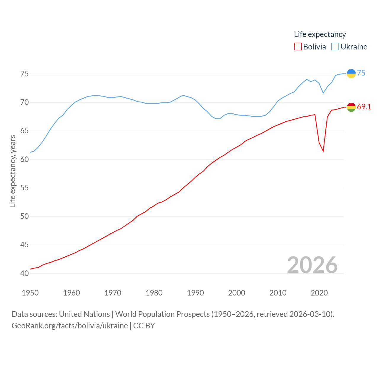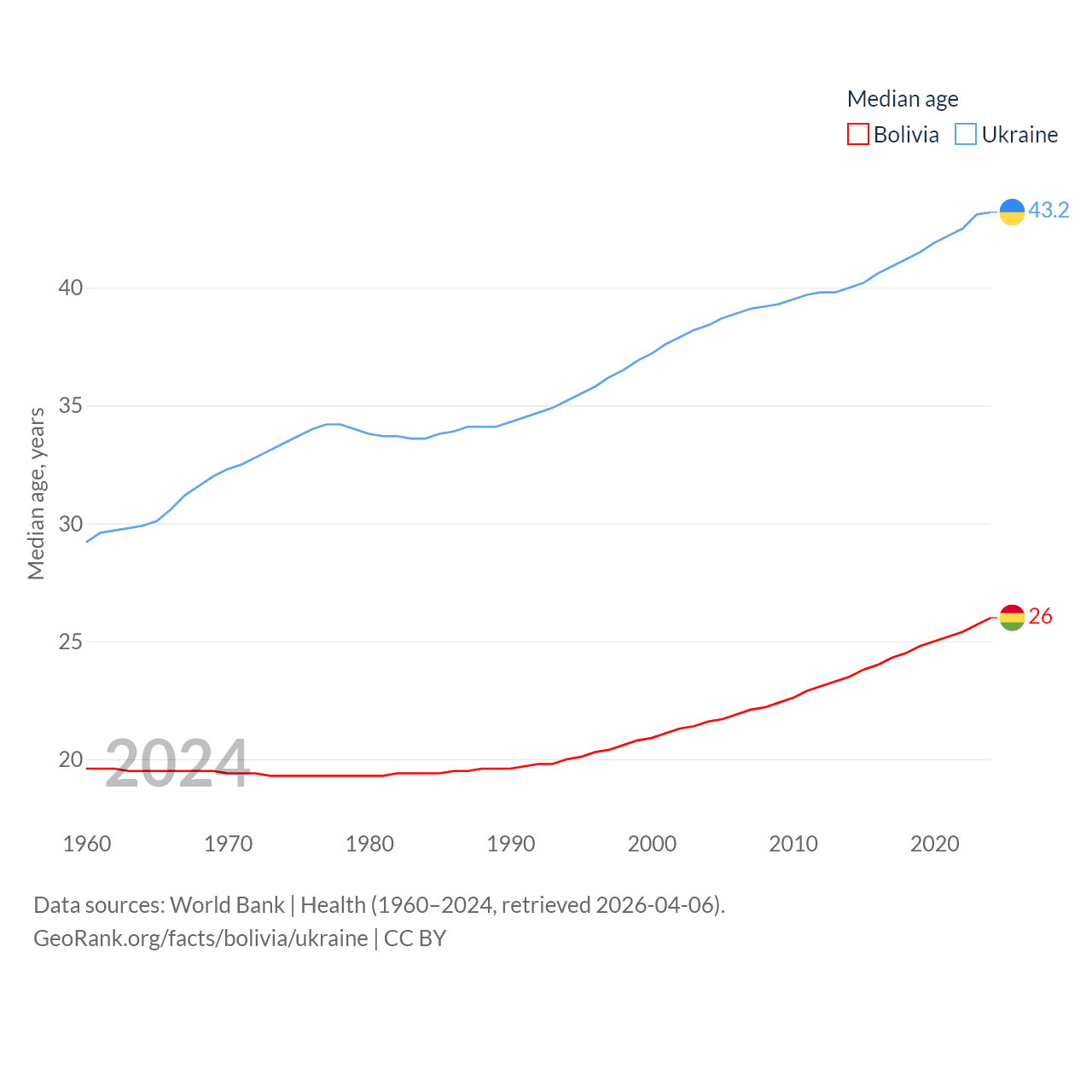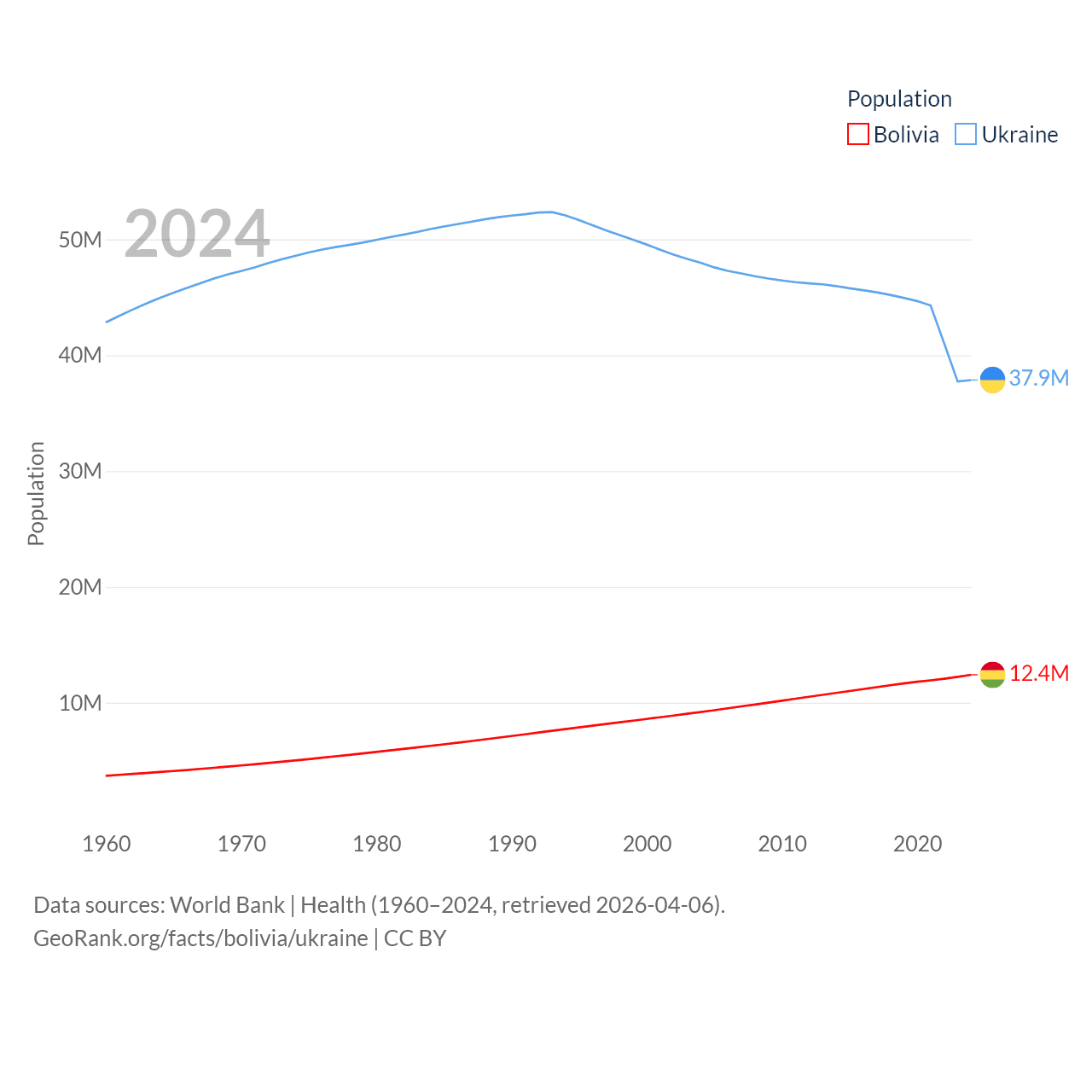 Bolivia has a population of 12.4M (ranked 79/197), compared with 37.9M in Ukraine (ranked 41/197). Bolivia's land area is 418,264 sq mi versus 223,708 sq mi for Ukraine (ranked 27th vs. 46th).