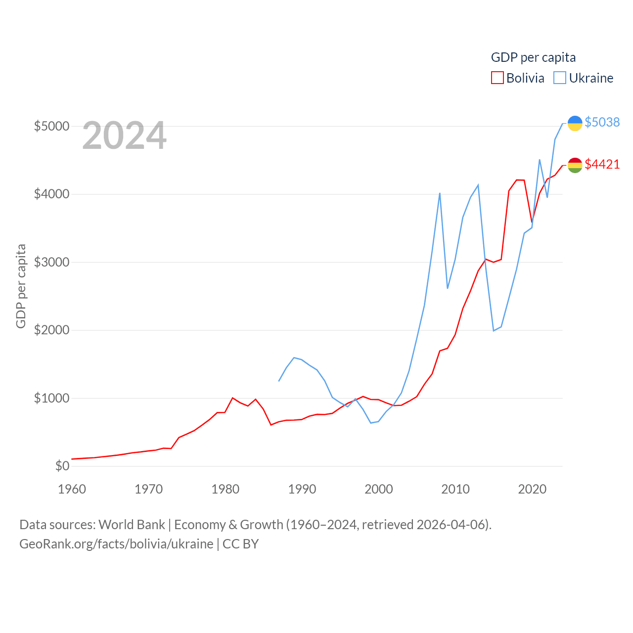 By GDP, Bolivia ranks 88/197 ($54.9B) and Ukraine ranks 57/197 ($191B). By GDP per capita, Bolivia ranks 125/197 ($4,421), while Ukraine ranks 120/197 ($5,038).