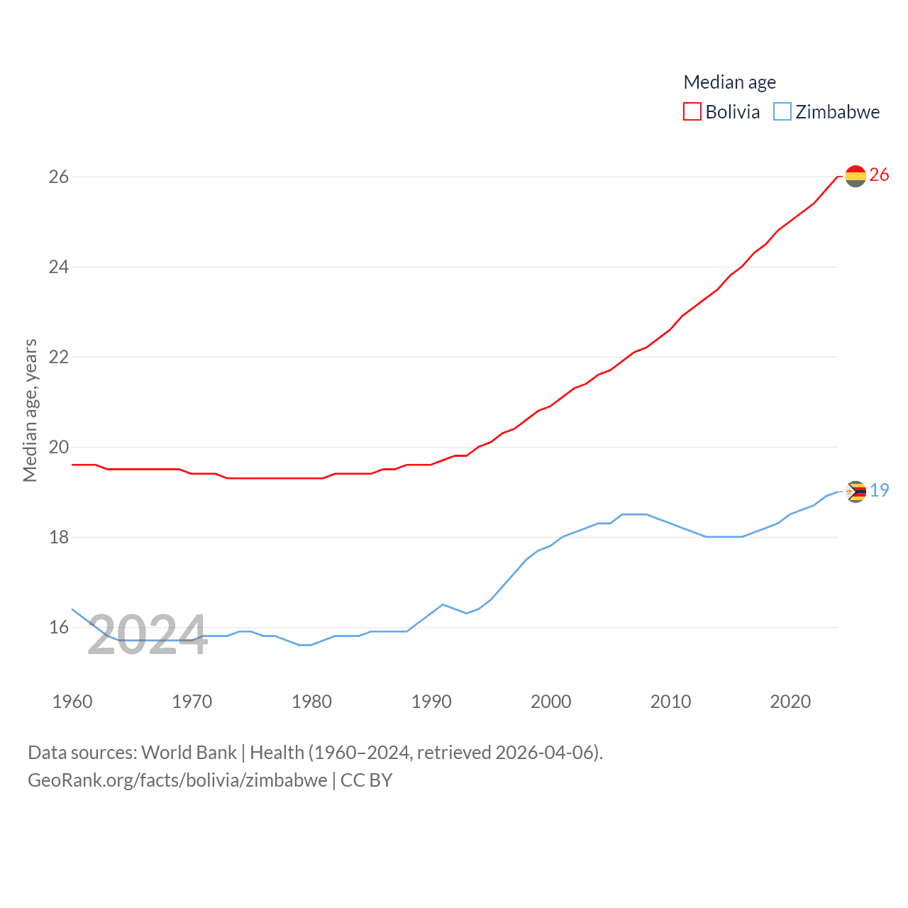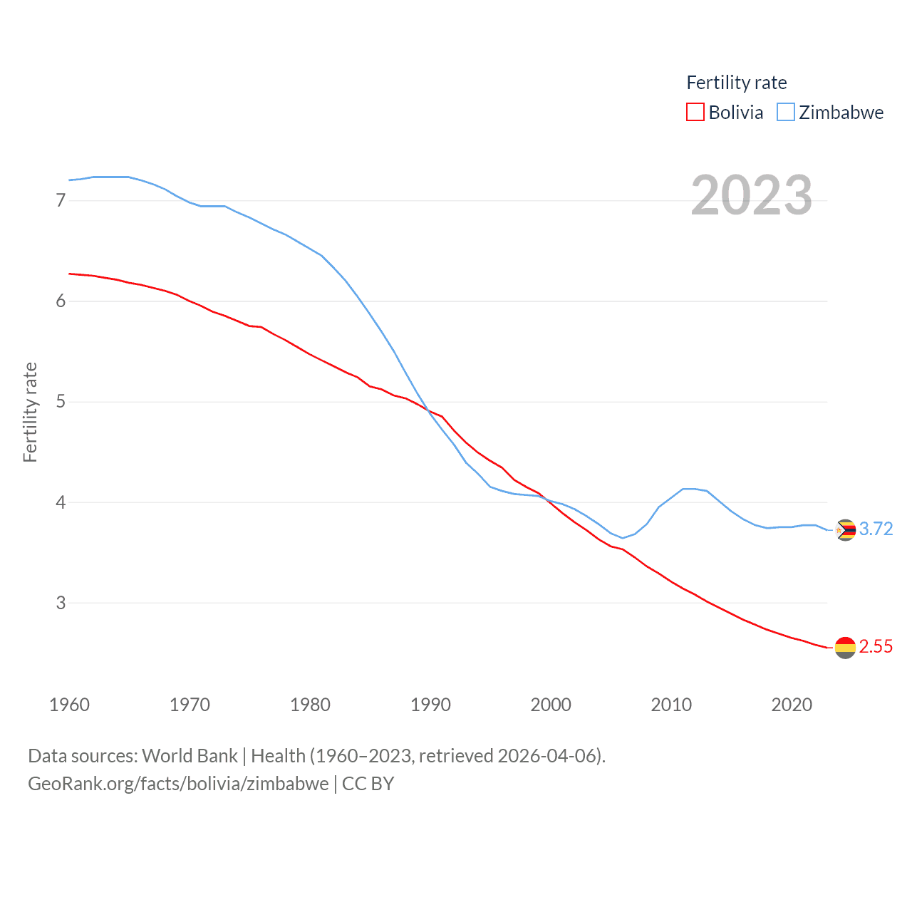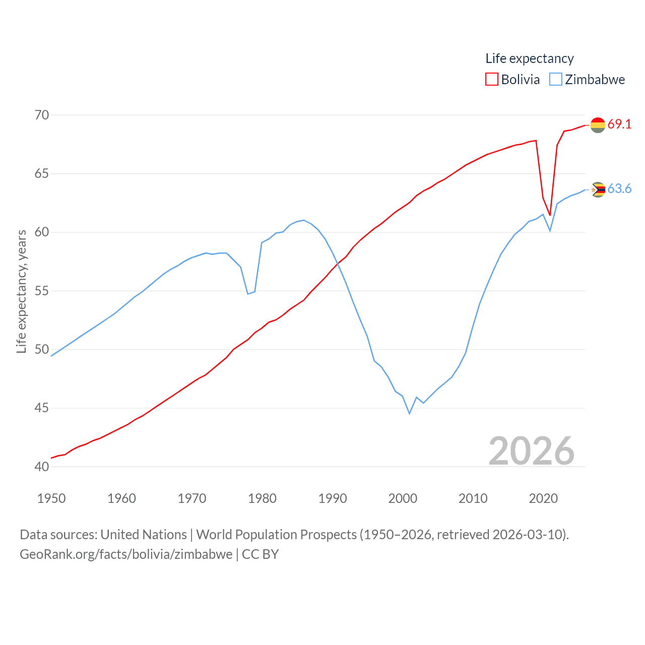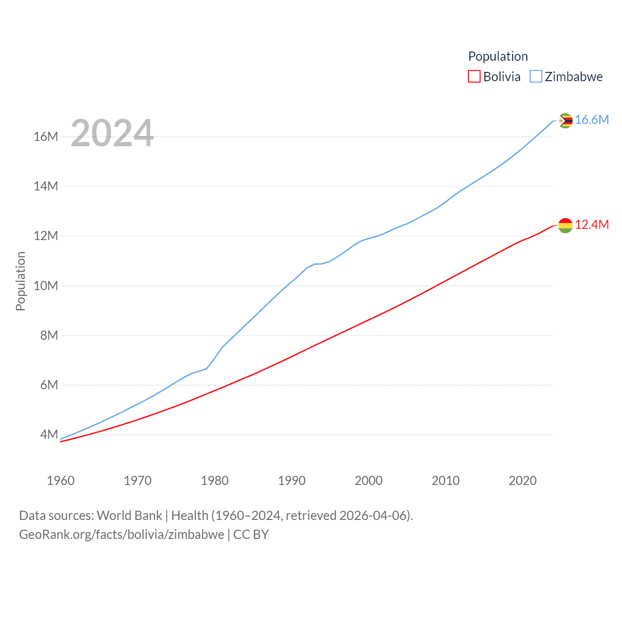 Bolivia has a population of 12.4M (ranked 79/197), compared with 16.6M in Zimbabwe (ranked 74/197). Bolivia's land area is 418,264 sq mi versus 149,364 sq mi for Zimbabwe (ranked 27th vs. 60th).