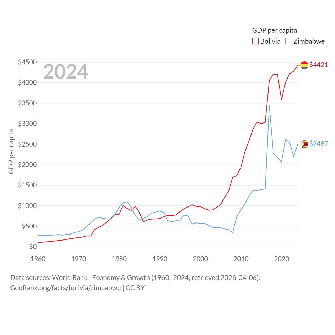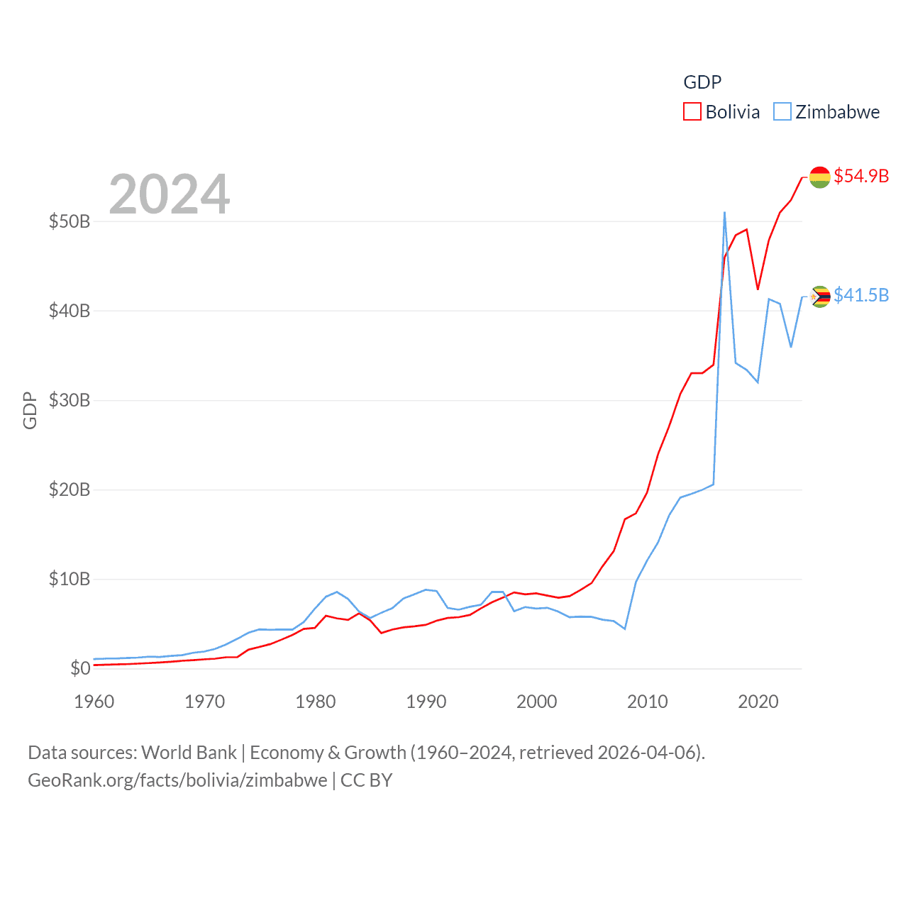 By GDP, Bolivia ranks 88/197 ($54.9B) and Zimbabwe ranks 102/197 ($41.5B). By GDP per capita, Bolivia ranks 125/197 ($4,421), while Zimbabwe ranks 148/197 ($2,497).