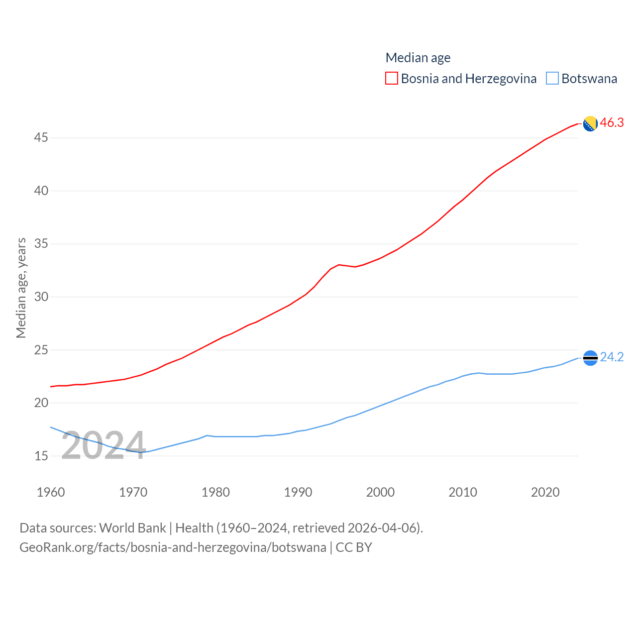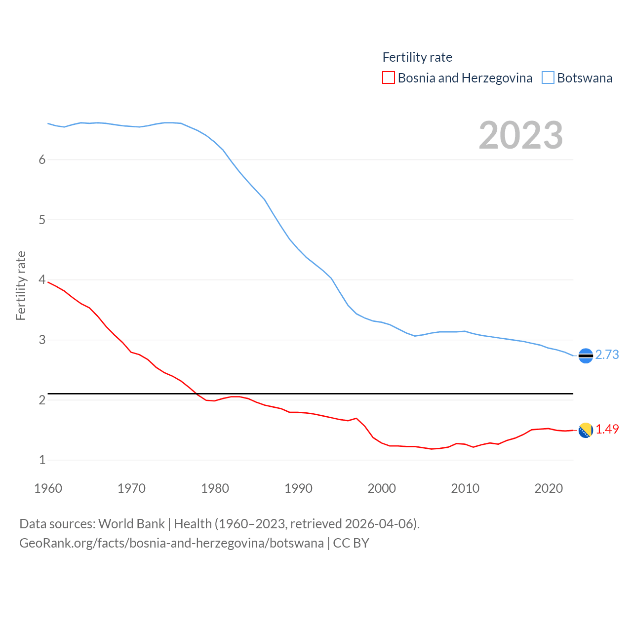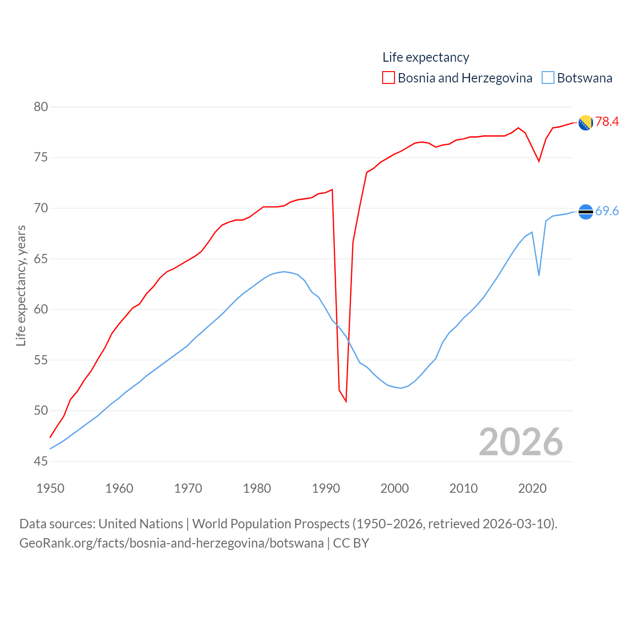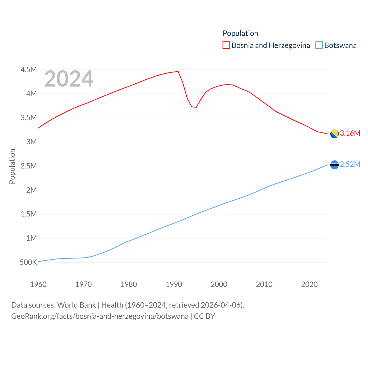 Bosnia and Herzegovina has a population of 3.16M (ranked 134/197), compared with 2.52M in Botswana (ranked 142/197). Bosnia and Herzegovina's land area is 19,768 sq mi versus 218,816 sq mi for Botswana (ranked 125th vs. 47th).