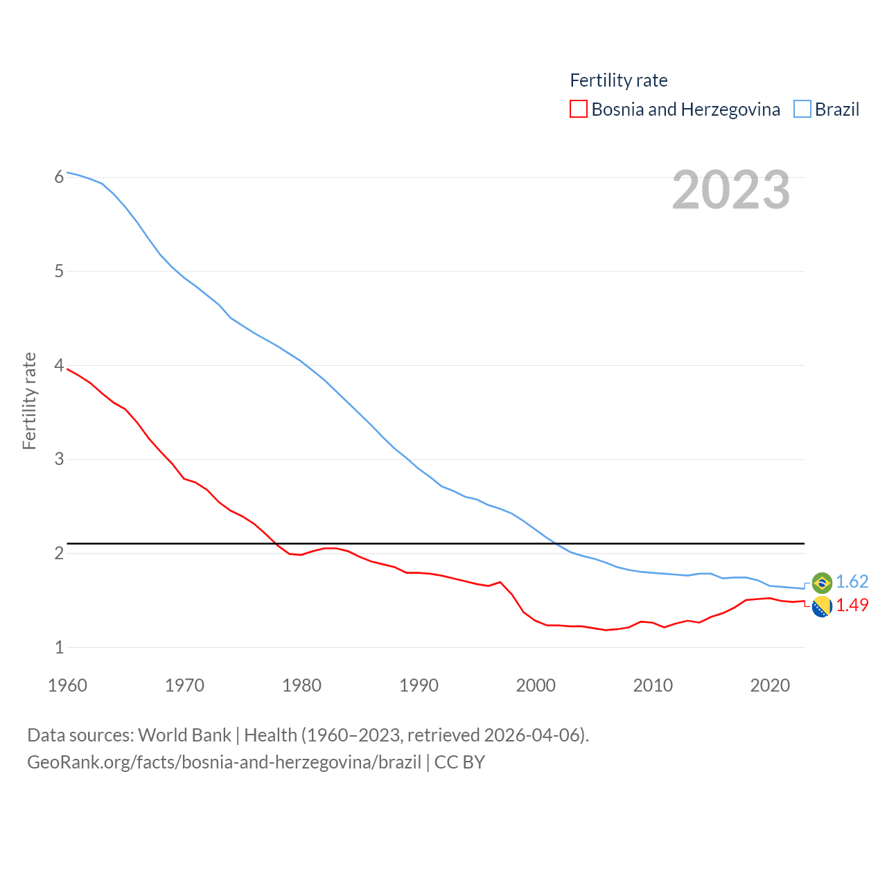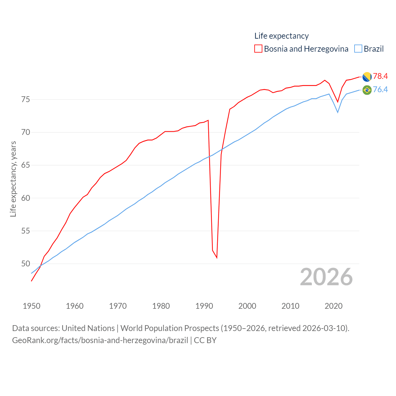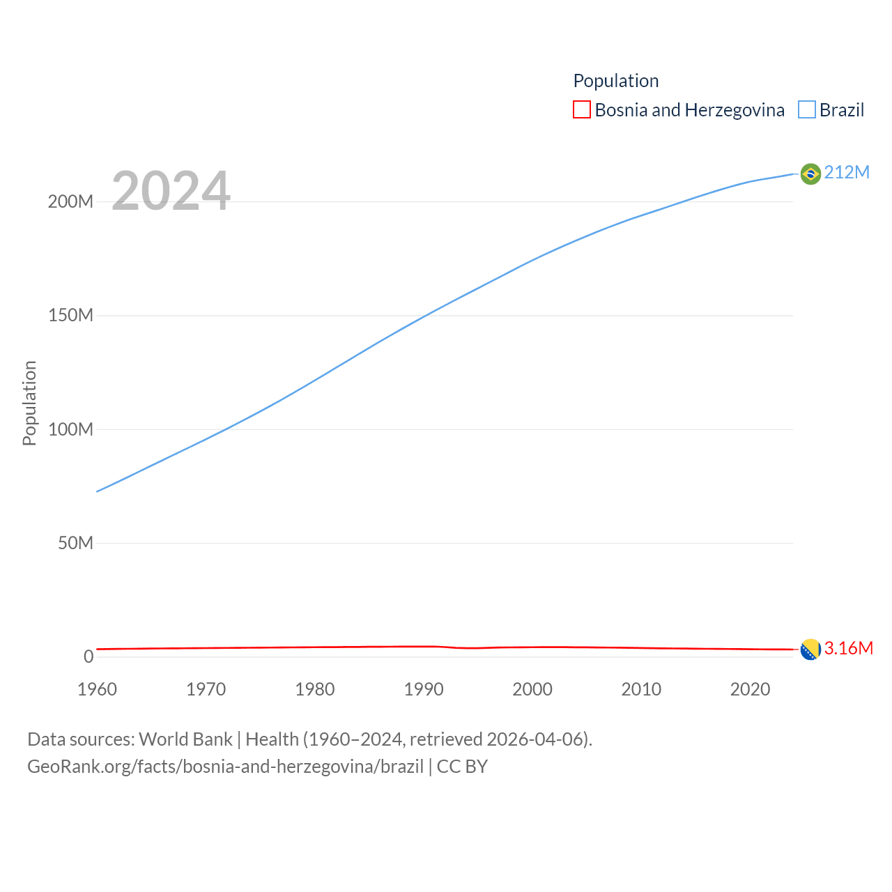 Bosnia and Herzegovina has a population of 3.16M (ranked 134/197), compared with 212M in Brazil (ranked 7/197). Bosnia and Herzegovina's land area is 19,768 sq mi versus 3,227,096 sq mi for Brazil (ranked 125th vs. 5th).