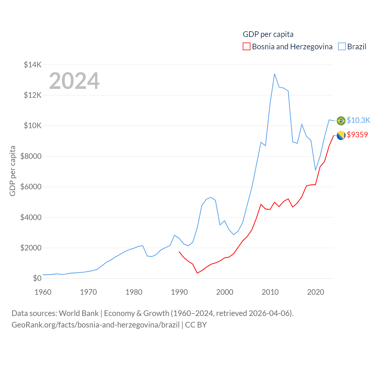 By GDP, Bosnia and Herzegovina ranks 111/197 ($29.6B) and Brazil ranks 10/197 ($2.19T). By GDP per capita, Bosnia and Herzegovina ranks 87/197 ($9,359), while Brazil ranks 85/197 ($10,311).