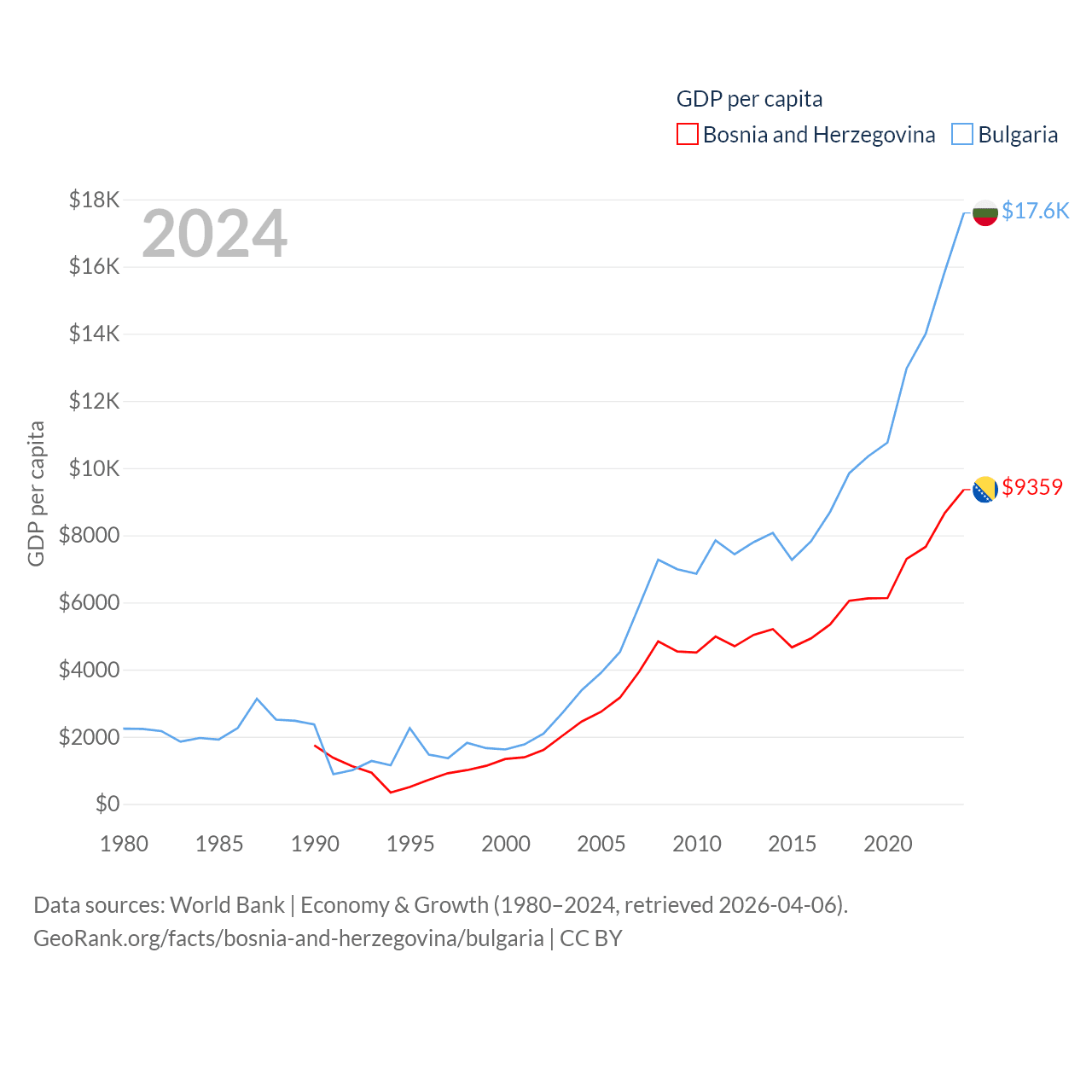 By GDP, Bosnia and Herzegovina ranks 111/197 ($29.6B) and Bulgaria ranks 67/197 ($113B). By GDP per capita, Bosnia and Herzegovina ranks 87/197 ($9,359), while Bulgaria ranks 64/197 ($17,596).