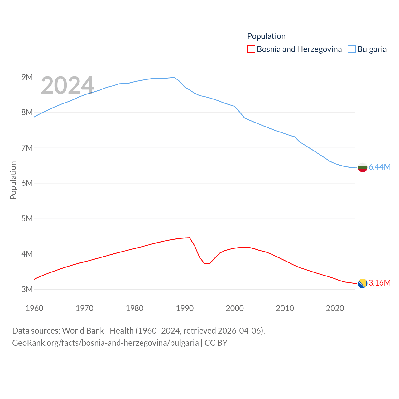 Bosnia and Herzegovina has a population of 3.16M (ranked 134/197), compared with 6.44M in Bulgaria (ranked 110/197). Bosnia and Herzegovina's land area is 19,768 sq mi versus 41,915 sq mi for Bulgaria (ranked 125th vs. 101st).