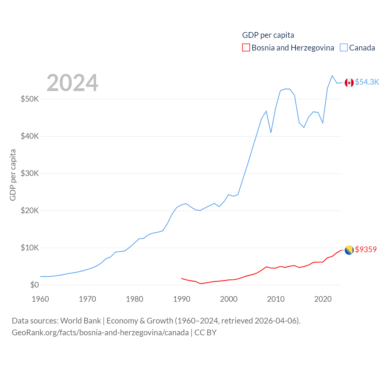 By GDP, Bosnia and Herzegovina ranks 111/197 ($29.6B) and Canada ranks 9/197 ($2.24T). By GDP per capita, Bosnia and Herzegovina ranks 87/197 ($9,359), while Canada ranks 20/197 ($54,340).