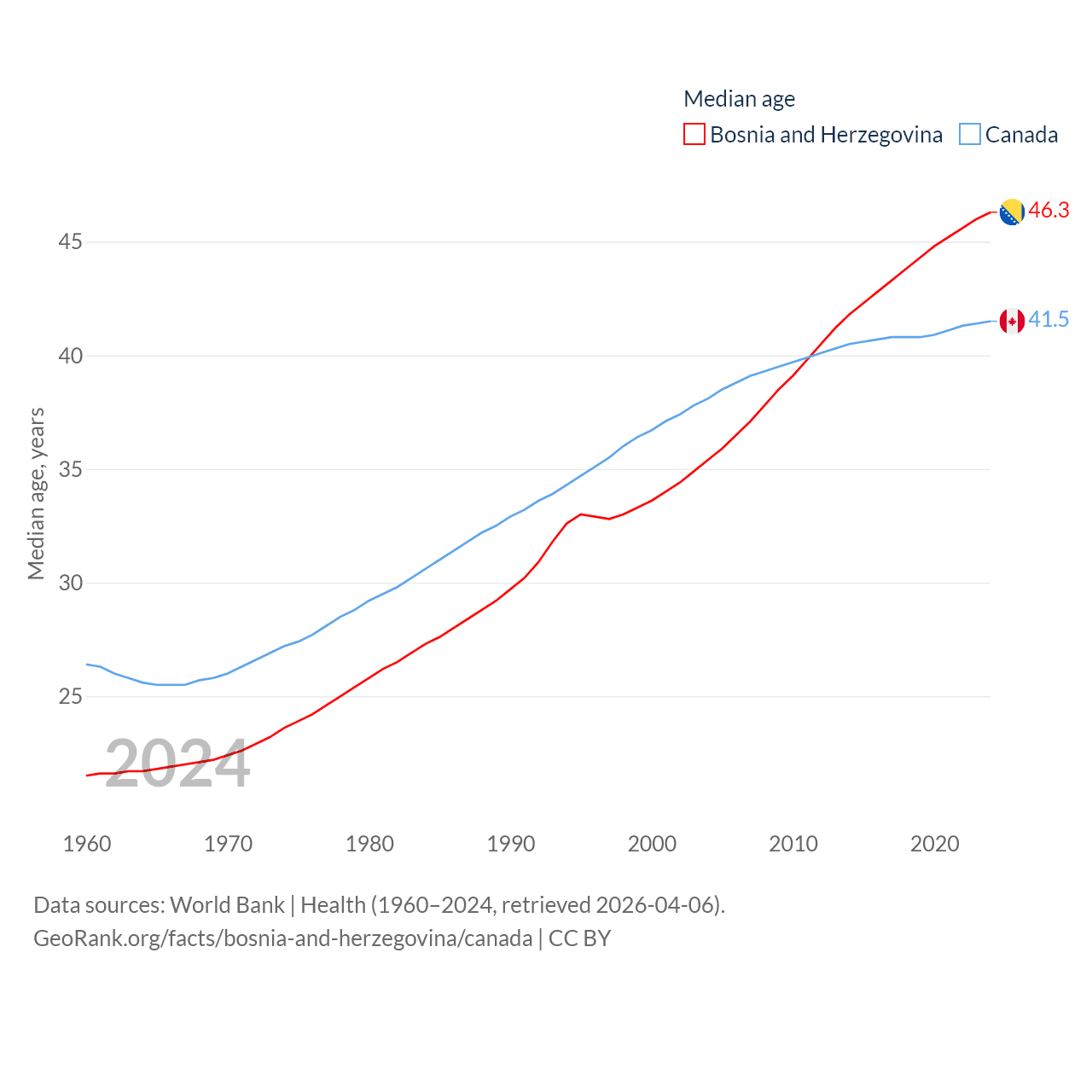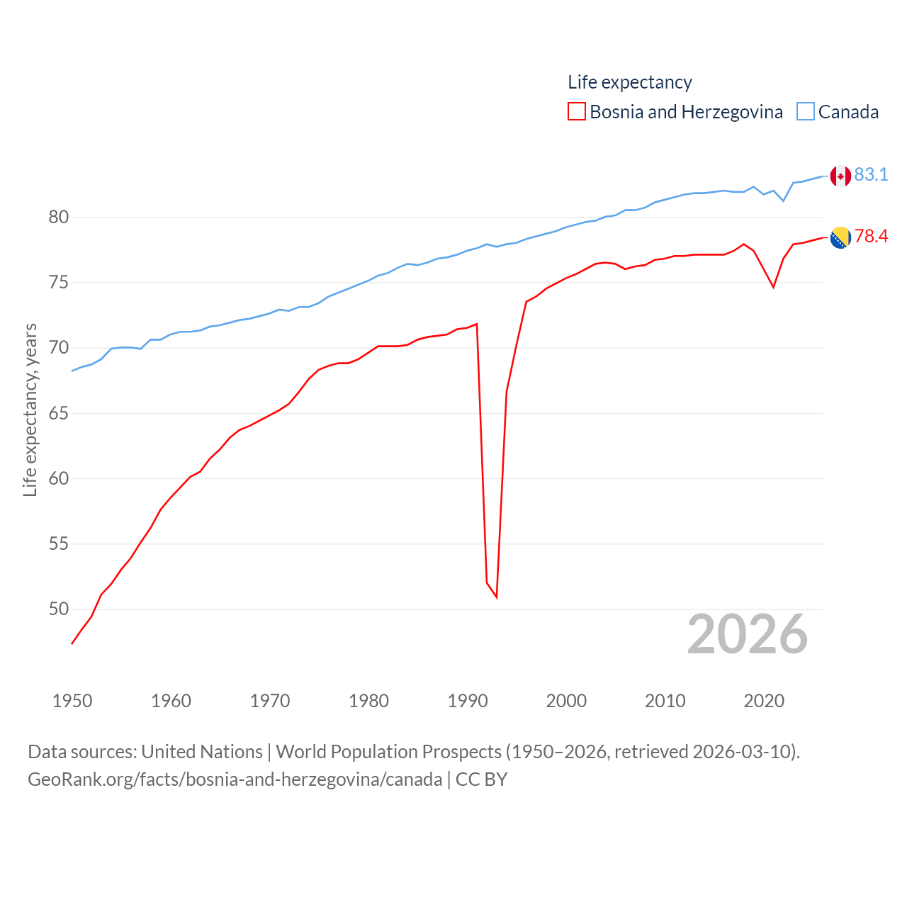 Bosnia and Herzegovina has a population of 3.16M (ranked 134/197), compared with 41.3M in Canada (ranked 37/197). Bosnia and Herzegovina's land area is 19,768 sq mi versus 3,393,336 sq mi for Canada (ranked 125th vs. 4th).
