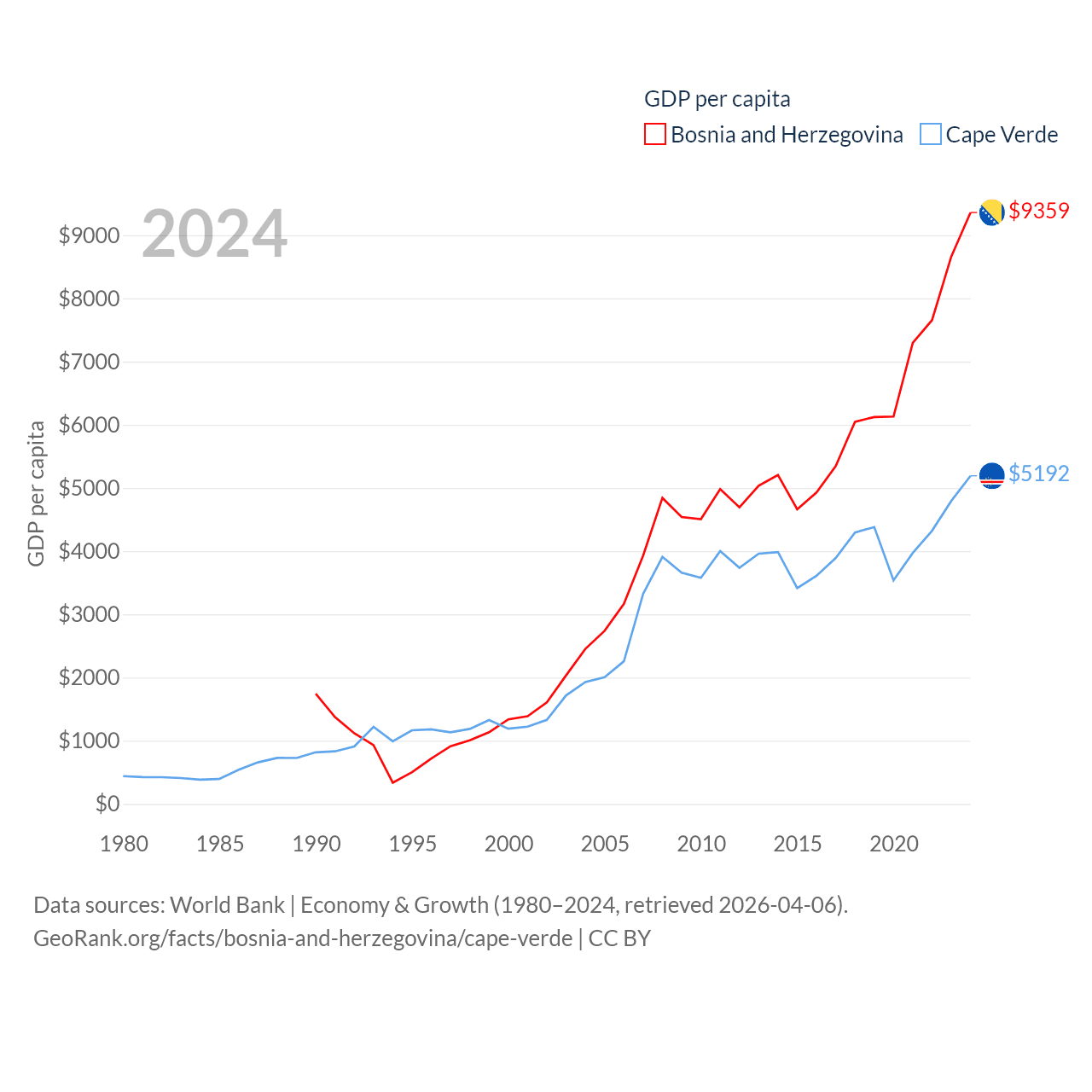 By GDP, Bosnia and Herzegovina ranks 111/197 ($29.6B) and Cape Verde ranks 172/197 ($2.73B). By GDP per capita, Bosnia and Herzegovina ranks 87/197 ($9,359), while Cape Verde ranks 118/197 ($5,192).