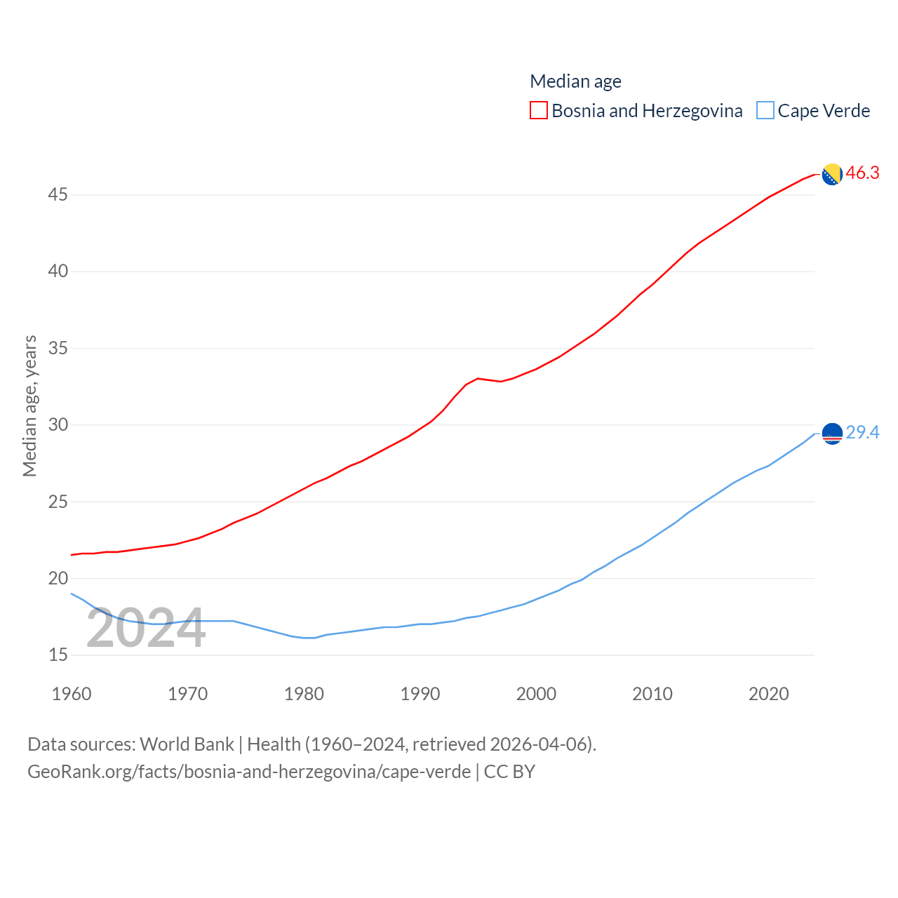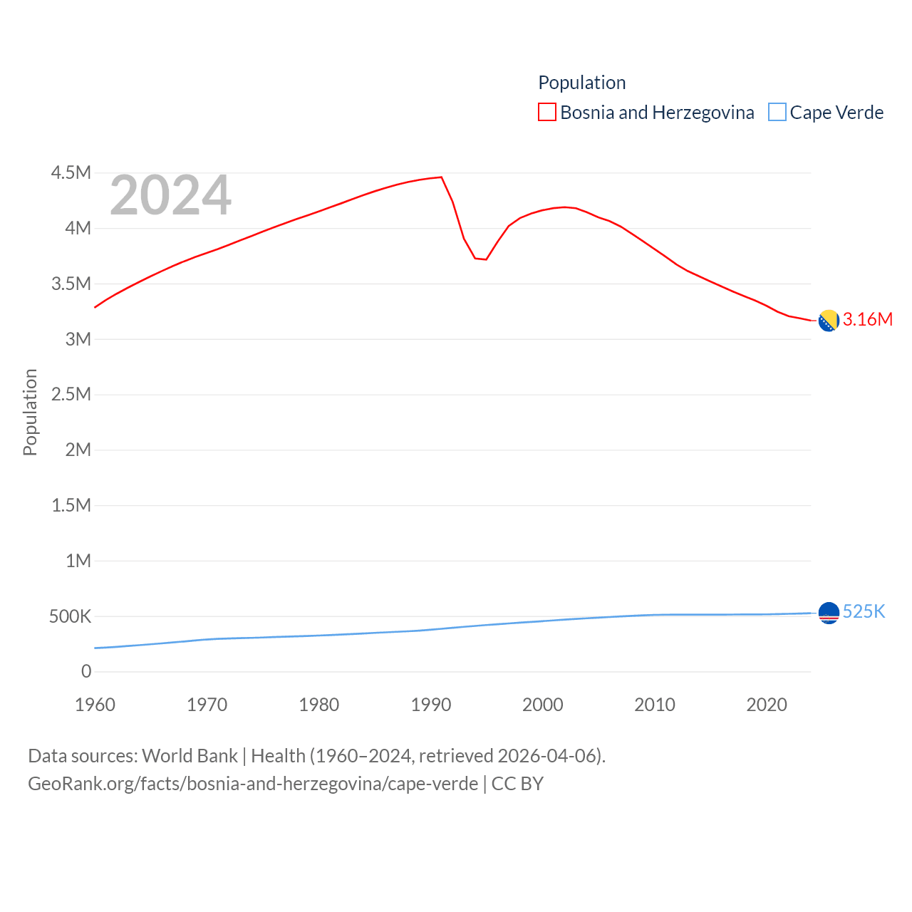 Bosnia and Herzegovina has a population of 3.16M (ranked 134/197), compared with 525K in Cape Verde (ranked 169/197). Bosnia and Herzegovina's land area is 19,768 sq mi versus 1,556 sq mi for Cape Verde (ranked 125th vs. 167th).