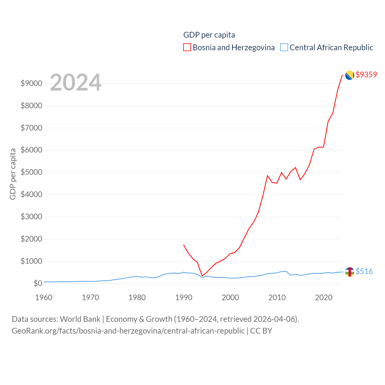 By GDP, Bosnia and Herzegovina ranks 111/197 ($29.6B) and The Central African Republic ranks 171/197 ($2.75B). By GDP per capita, Bosnia and Herzegovina ranks 87/197 ($9,359), while The Central African Republic ranks 195/197 ($516).