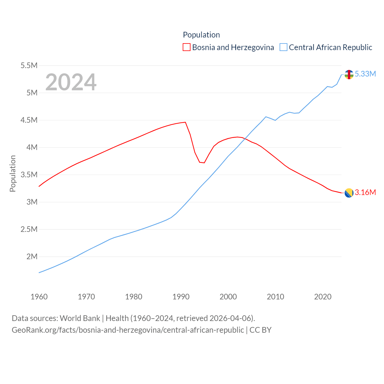 Bosnia and Herzegovina has a population of 3.16M (ranked 134/197), compared with 5.33M in The Central African Republic (ranked 121/197). Bosnia and Herzegovina's land area is 19,768 sq mi versus 240,534 sq mi for The Central African Republic (ranked 125th vs. 43rd).