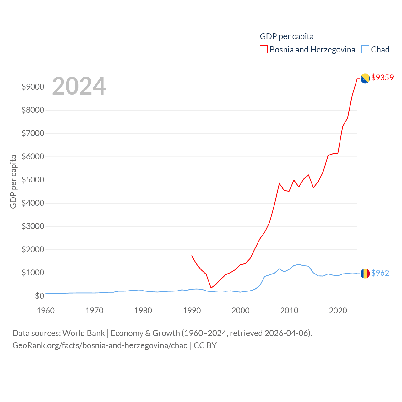By GDP, Bosnia and Herzegovina ranks 111/197 ($29.6B) and Chad ranks 132/197 ($19.5B). By GDP per capita, Bosnia and Herzegovina ranks 87/197 ($9,359), while Chad ranks 182/197 ($962).