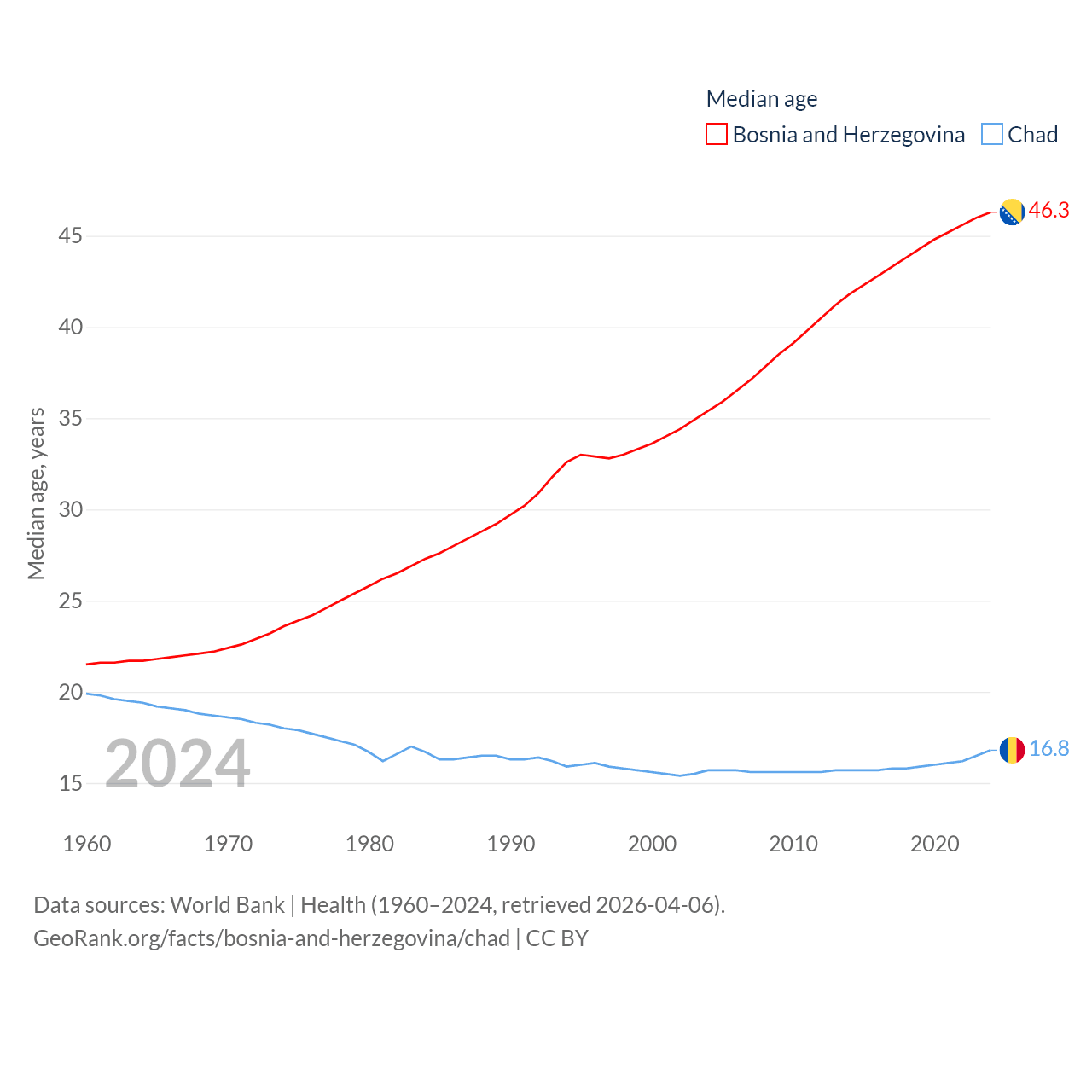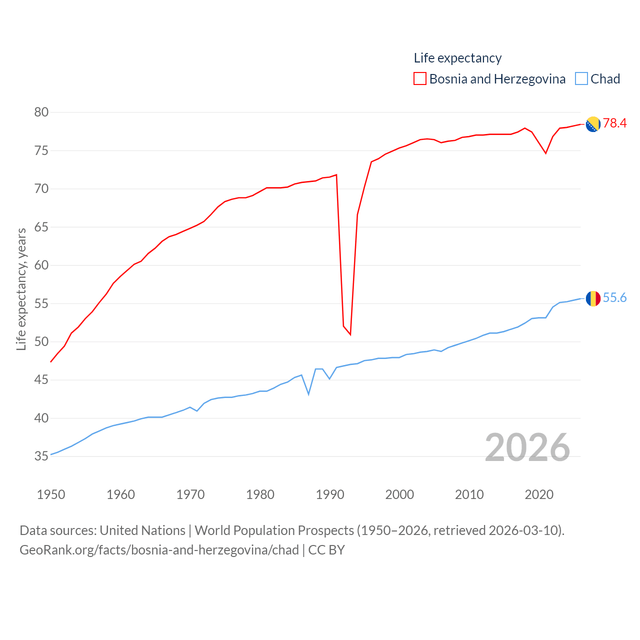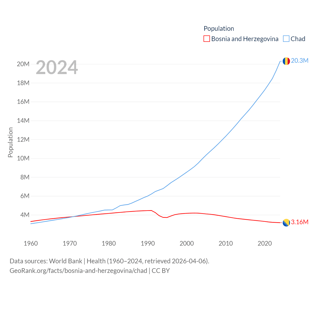 Bosnia and Herzegovina has a population of 3.16M (ranked 134/197), compared with 20.3M in Chad (ranked 65/197). Bosnia and Herzegovina's land area is 19,768 sq mi versus 486,180 sq mi for Chad (ranked 125th vs. 21st).